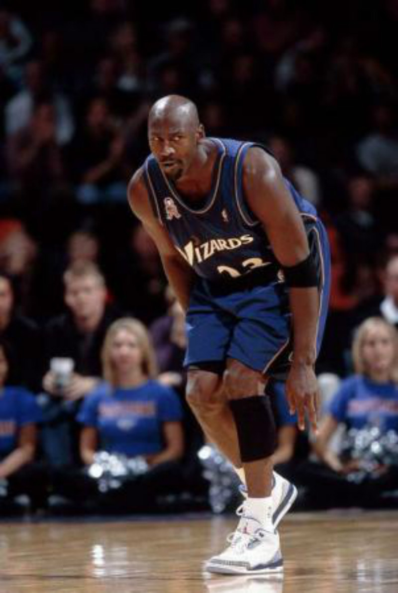 39 岁的乔丹第二次复出,为奇才队效力就穿着过经典的 Air Jordan 3 “True Blue”。