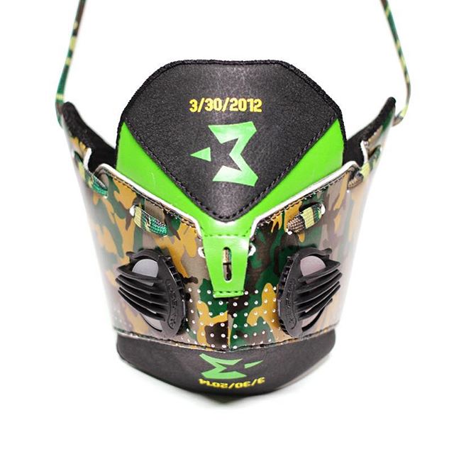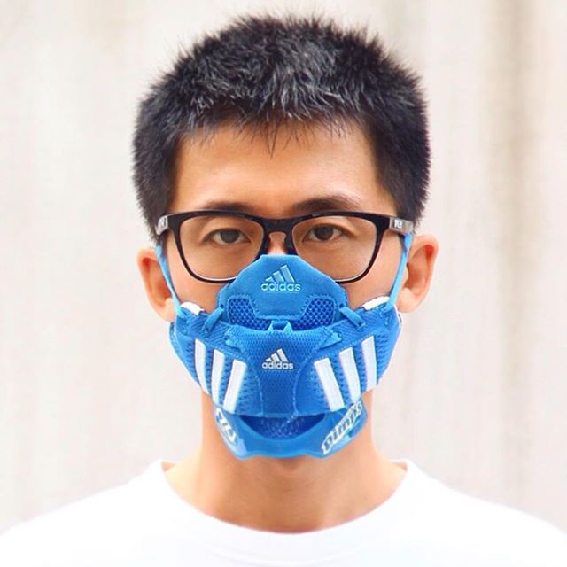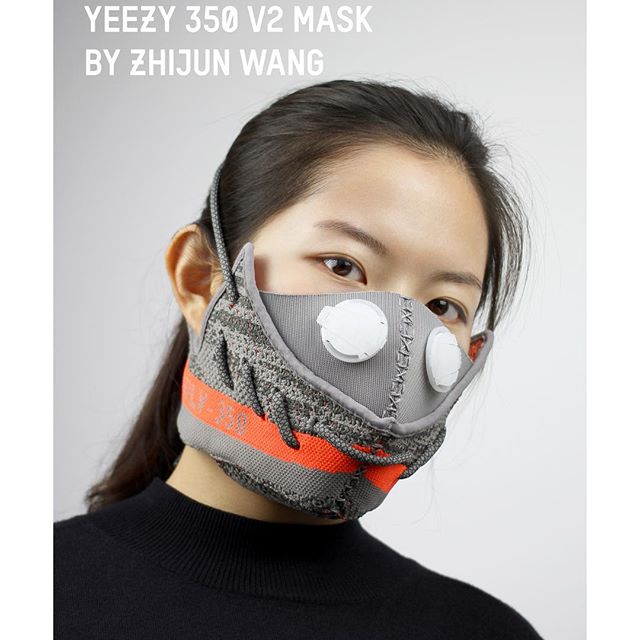 北京知名设计师王志钧为了抵抗近期的北京雾霾在创新作品。将一双 adidas Yeezy 350 Boost V2 “Beluga” 改造成球鞋口罩,并保留标志性的橙色条纹以及 “SPLY-350” 字样,用鞋带进行穿插,其想法新颖独特,造型时尚前卫。