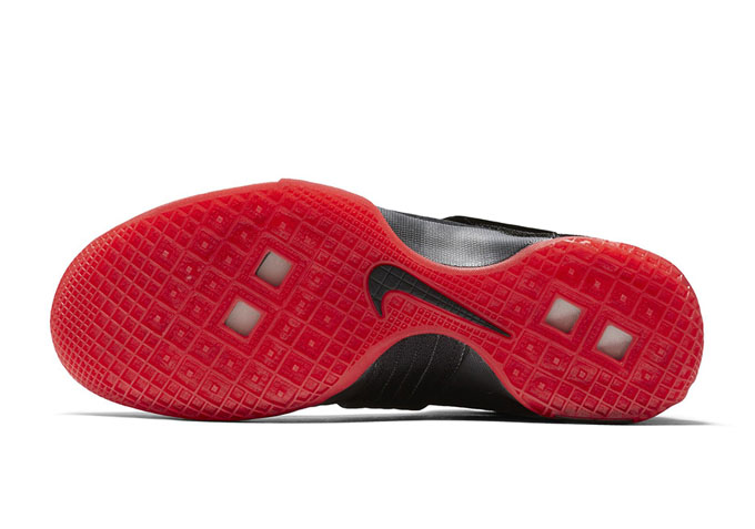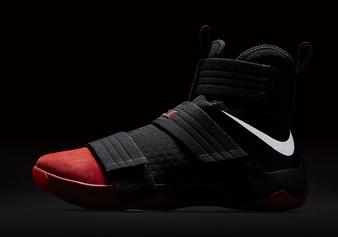 Nike LeBron Soldier 10 “Suede Toe” 鞋身以黑色为主色调,而鞋头改用红色麂皮材质。Nike Swoosh 以黑色为主,并用红色勾边,黑色材料带有 3M 的反光效果。