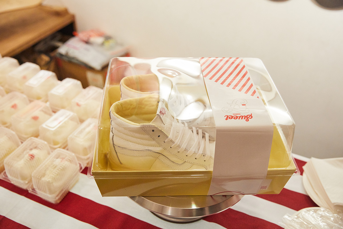 另外一双同 FLY 的合作款则以 Vans Sk8-Hi 高帮鞋型作为蓝本,灵感则来源于上海特色奶油小方。