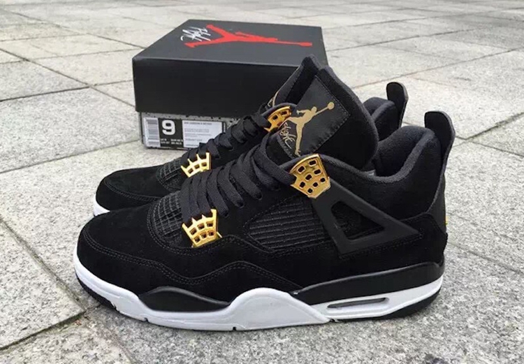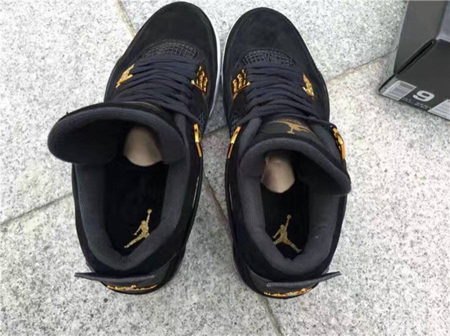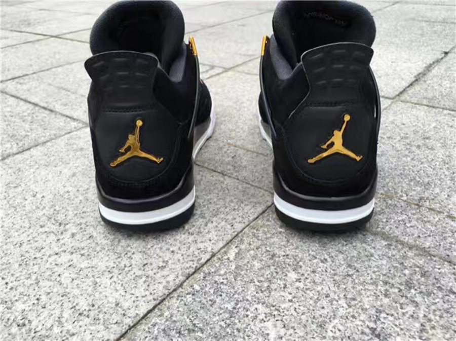 眼前这款 Air Jordan 4 “Royalty” 鞋身采用磨砂质感的黑色牛巴戈打造,金色鞋扣与后跟 “Jumpman” 营造出雍容典雅的华丽气氛。