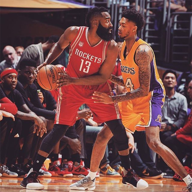 在今天火箭对阵湖人的比赛中,哈登上脚了自己的首款签名战靴 adidas Harden Vol. 1,这款黑白红的 Pioneer 配色的首发配色也是这双 Harden Vol. 1 的广告色。 不过新鞋上脚并未给球队带来胜利,哈登拿下 34 + 17,但依然在后半段落败。 图片中的英格拉姆则同样是 adidas 球鞋,上脚了 Crazylight Boost 2016 Low 低帮战靴。