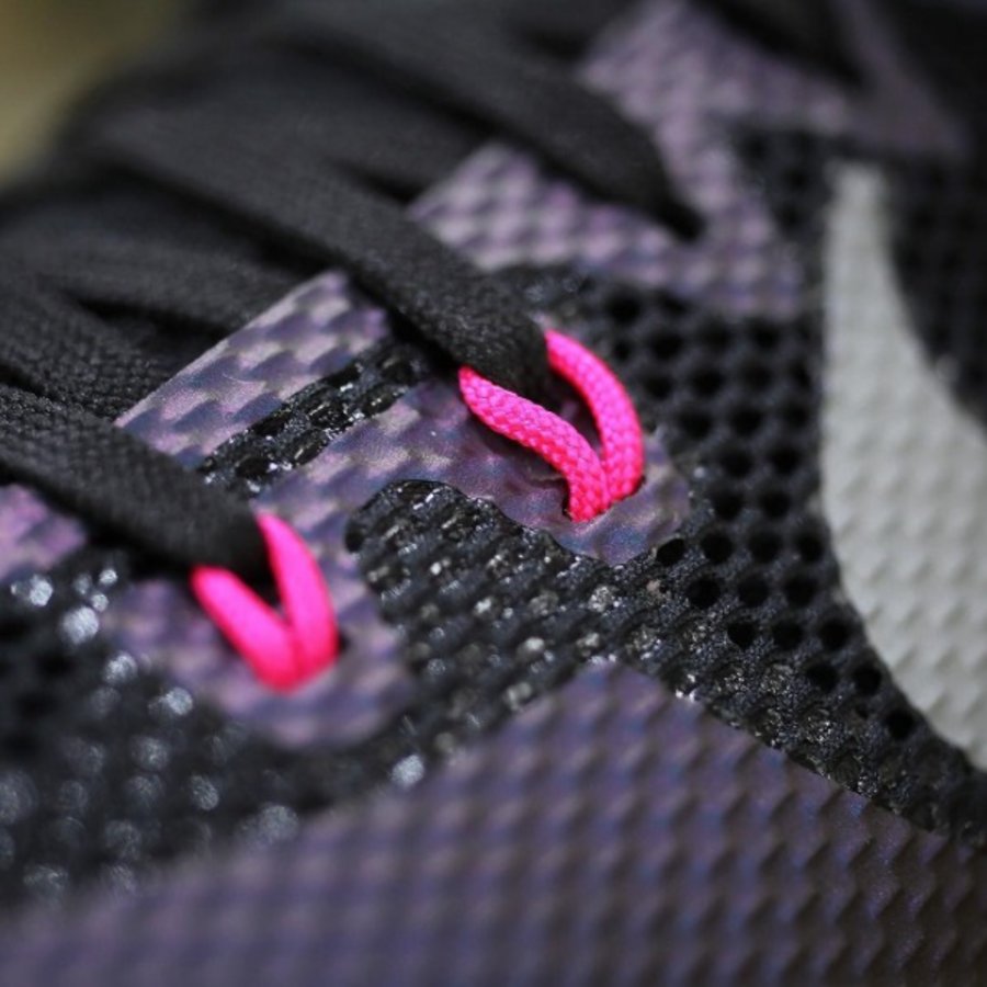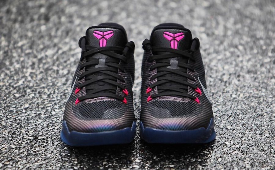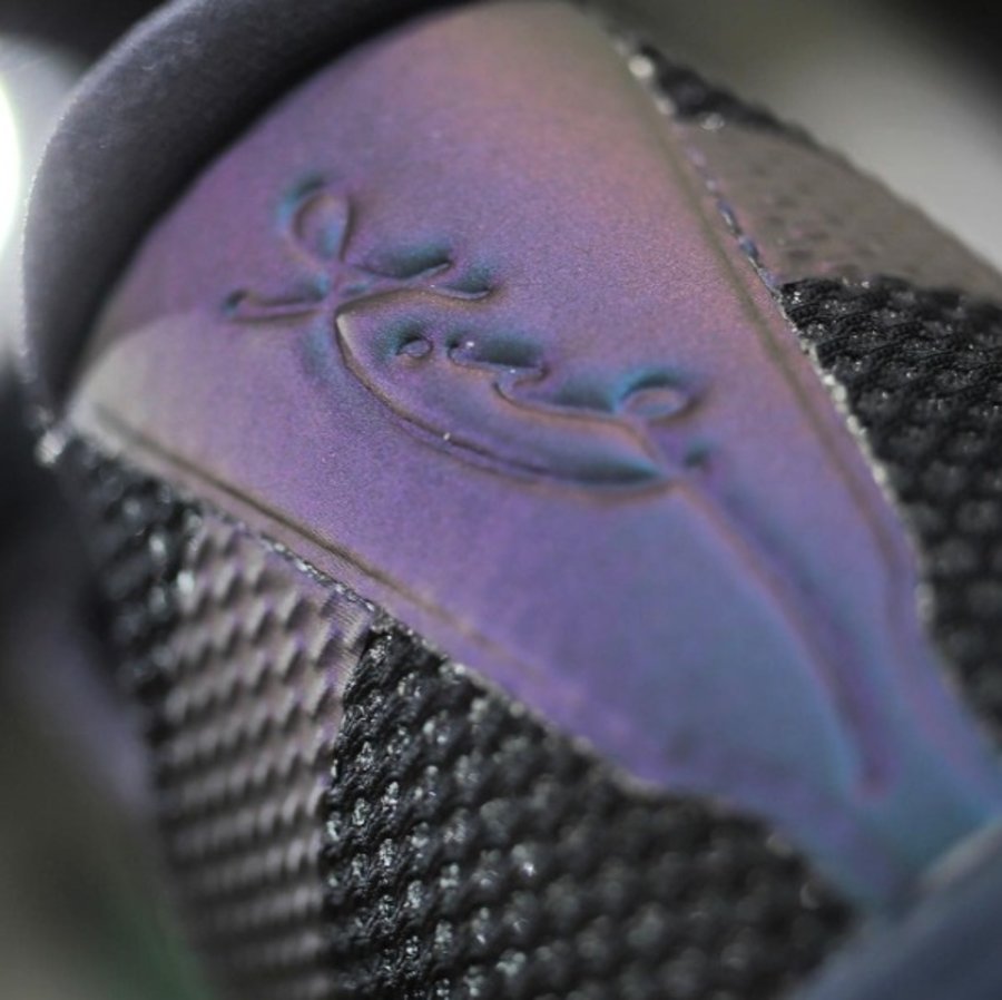 这款 Nike Kobe 11 “Invisibility Cloak”以黑色鞋身为主,不但配有粉色的细节与反光 Nike Swoosh,鞋身处还采用了 Nike Zoom Kobe 7 隐形人的暗紫色与绿松石色调。最后用蓝色水晶外底进行收尾也别有特点。