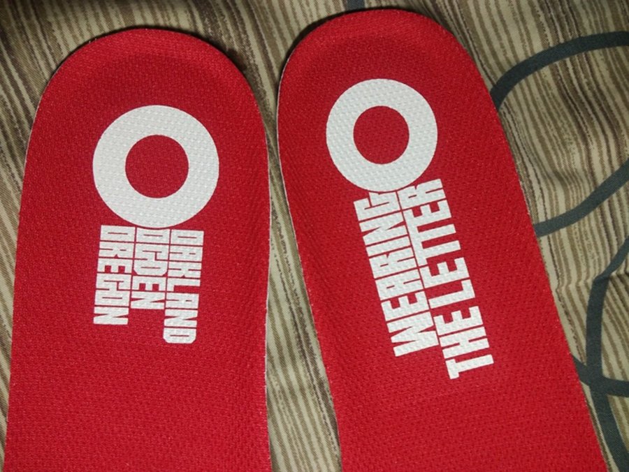 鞋垫上的文字图案分别代表 Oakland(故乡)、Ogden(大学)、Oregon(目前所在城市) 而另一边 “Wearing The Letter O” 则是开拓者开场播报员介绍他出场时的惯用台词。