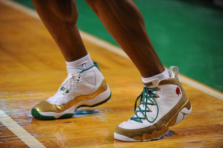 在本场比赛赛前热身的时候,雷·阿伦则上脚的是更换了绿色鞋带的白金 Air Jordan 9 “Bin 23” 与 Air Jordan 11 “Champion” PE 搭配的鸳鸯球鞋。