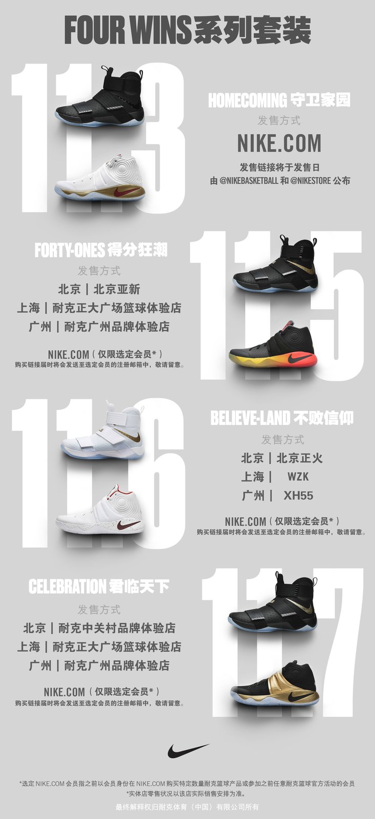 据 NikeBasketball 官微透露,11 月 3 日将在官网发售 Game 3 冠军套装。而从 11 月 5 日的 Game 5 套装开始,官网将仅限选定会员购买(选定会员指之前以会员身份在 Nike.com 购买特定数量耐克篮球产品或参加之前任意耐克篮球官方获得的会员)。此外每个套装线下发售店铺也有所不同,详情请见下图或访问 NikeBasketball 官方微博。