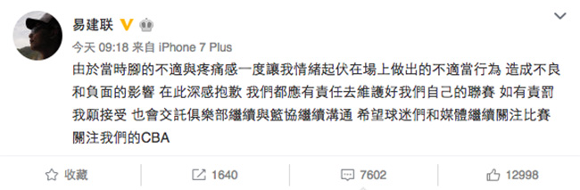 这就是昨天事情的经过,今天上午易建联在微博上发声,表示了歉意。