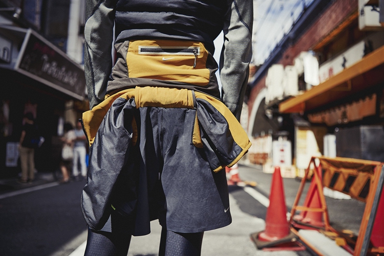 Gyakusou 系列的口袋结构从一开始几乎就是一样的,它们的目的就是分开存储硬币、钥匙和手机,所以不仅不会发出声响,而且很容易找到。在这一系列中,我采用了新的 Quickburst® 拉链和可拆卸的衣袖,当跑步者出现体温变化时可以使用这一功能。在与 NikeLab 团队的合作下,我在衣服上设计了一个用于收纳的开衩,可以把夹克或者衣袖脱下后从这里塞进去。