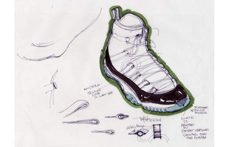 从图片中看,Air Jordan 10 代初稿打算采用后跟外露气垫设计,鞋身的格状纹理也与此后市售版本大不相同。而 Air Jordan 11 则已完善许多,十分接近后期公开发售的模样。