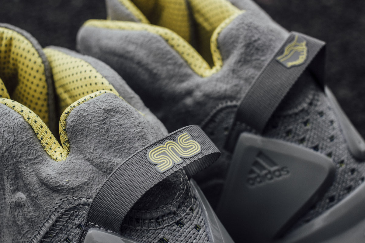 此番这款 Sneakersnstuff x adidas D Rose 7 鞋身以灰色的 Primeknit 材质与麂皮材质制作,搭配亮黄色内衬与细节,后跟鞋提处印有 Sneakersnstuff 标志性的 “SNS” 字样。中底依旧采用全掌的 Boost 缓震与鱼骨纹设计的透明大底。