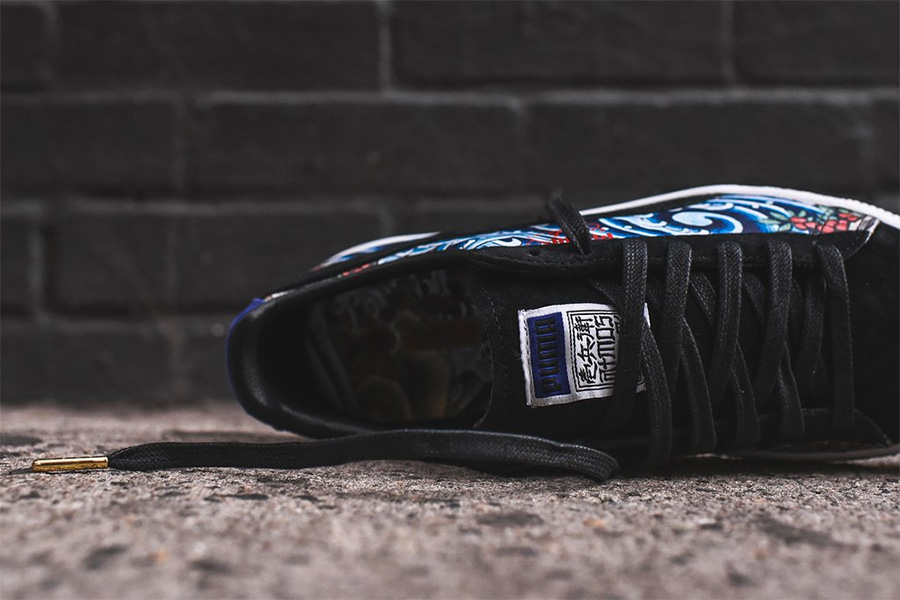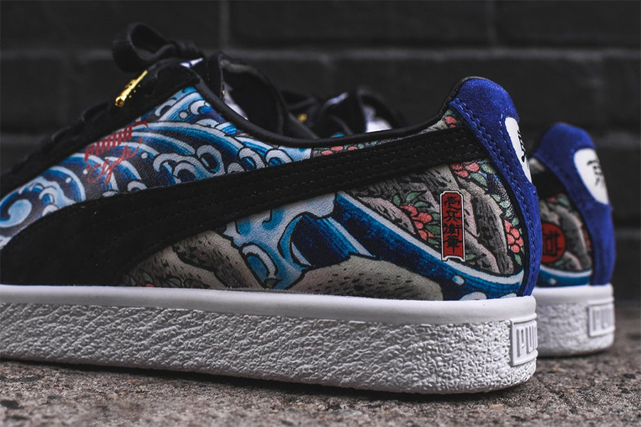 这双 Puma x atmos clyde “Three Tides Tattoo” 以第一眼的惊艳、第二眼的精美瞬间让人投降! 选用了经典的人气鞋型 Puma Suede 作为蓝本,黑色麂皮鞋头装饰金色鞋带头,在黑金基调之下,又成了日本纹身的精美图案,一张一弛之间完美彰显了独特的个性! 左右后跟呈现了东京字样,以表明联名单位的所在地。售价 $120 美元,目前已经在 RISE、KITH 等海外店铺上架,货号为 364304-01。