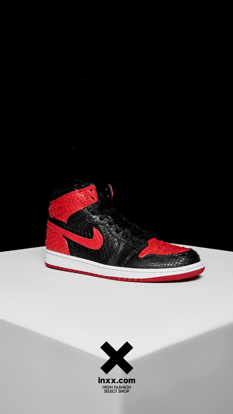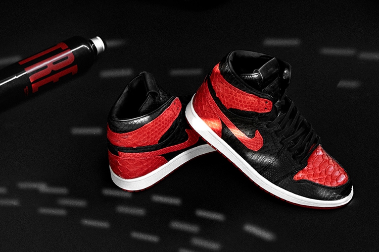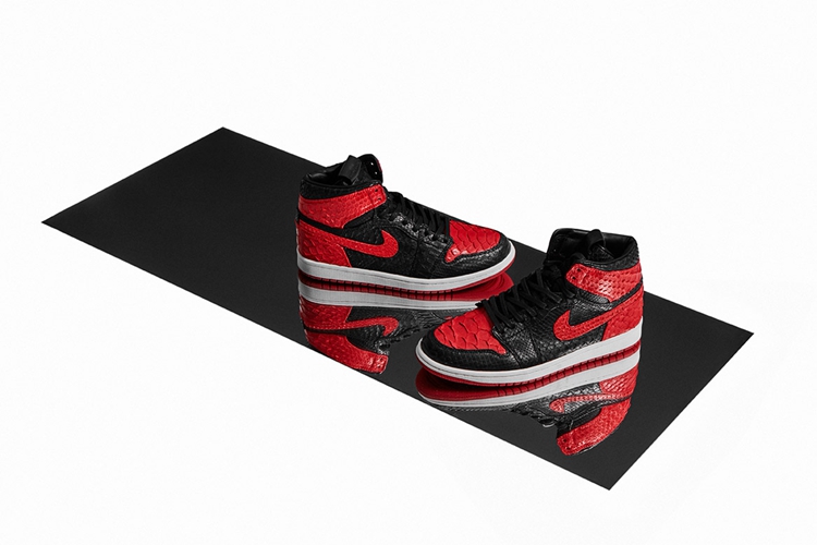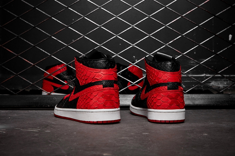 先锋时装买手品牌 INXX 联手球鞋定制机构 TheRemade 共同打造 Air Jordan 1 “Banned” 「蟒蛇皮客制版」限量鞋履。
