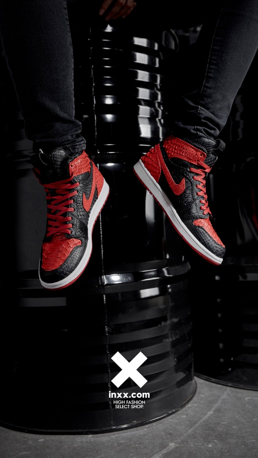 此番全新的 INXX x The Remade 蟒蛇皮客制版鞋履,以 Air Jordan 1 黑红系列为基础,在保留原版的乔丹一代鞋底之外,鞋面由顶级蟒蛇皮革打造,包边部分与内里均用细腻小羊皮制成。