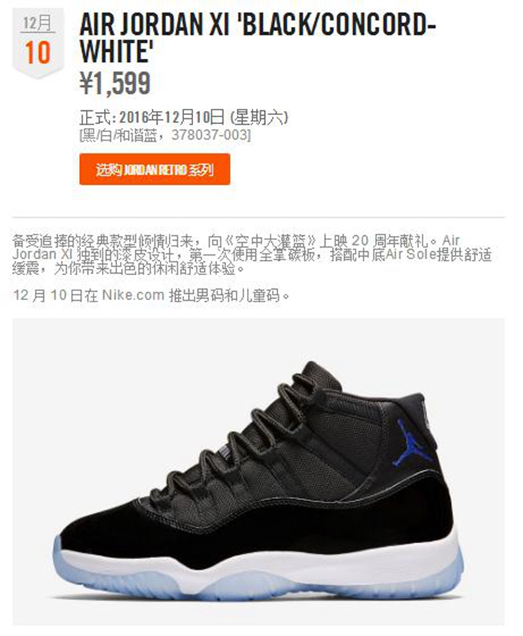 目前 Nike 国内官网已先行上架本次 “Space Jam” 相关的服饰,而近日这双万众关注的 Air Jordan 11 “Space Jam” 也终于出现在发售预告之中,发售日期为 2016 年 12 月 10 日,发售价格为 ¥1599 RMB。
