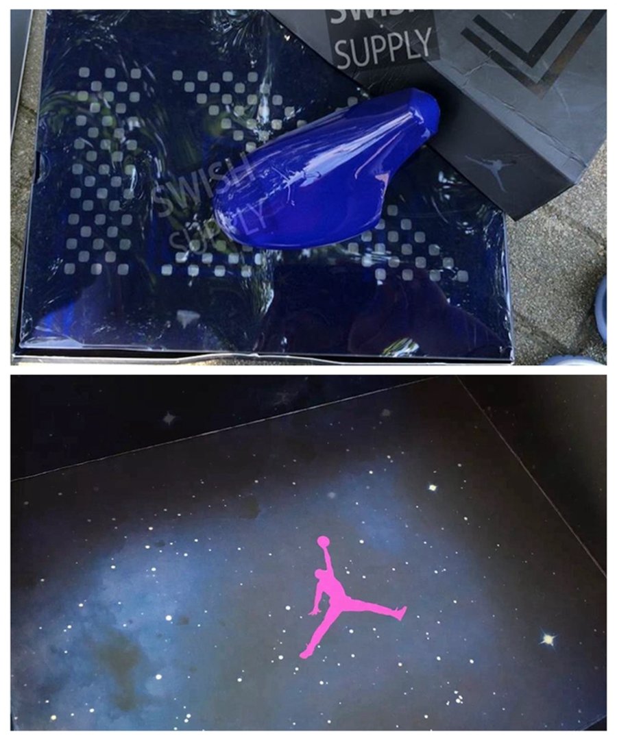 鞋盒内衬采用星空图案装饰。而美观高档的透明护罩和硬质鞋撑均采用蓝色打造,将 Air Jordan 11 的高规格表现依然延续。