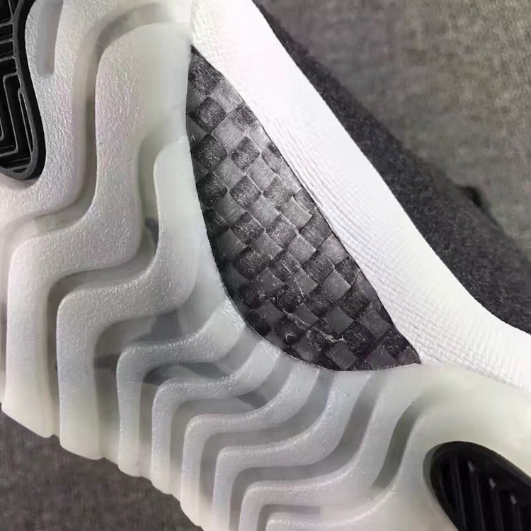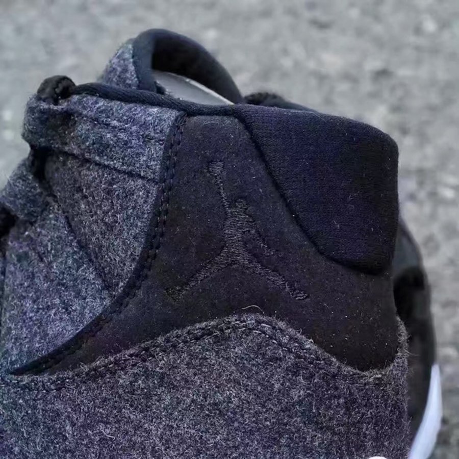 整体以深灰及黑色羊毛面料打造而成,鞋帮处 Jumpman Logo 以黑色刺绣呈现,搭配一席乳白色果冻外底,全新的质感体验在沉稳装扮下依然个性十足,内敛之余,独特的格调表露无遗!而后跟取消了号码设计,也许是为了更加休闲的考量。