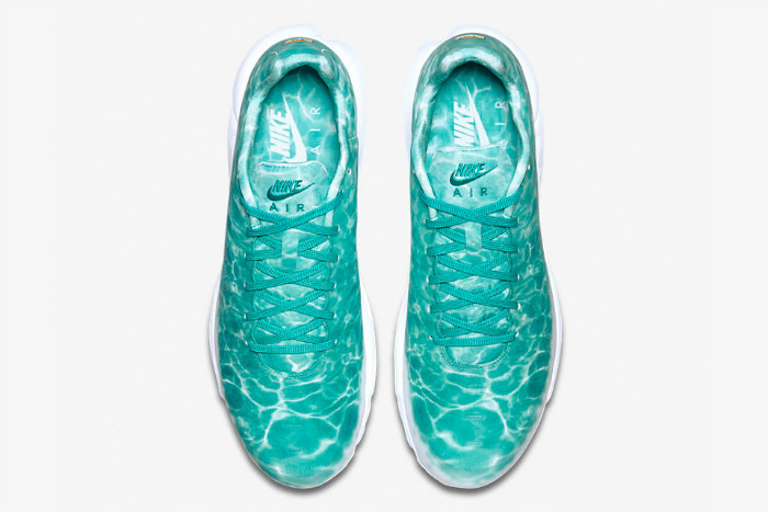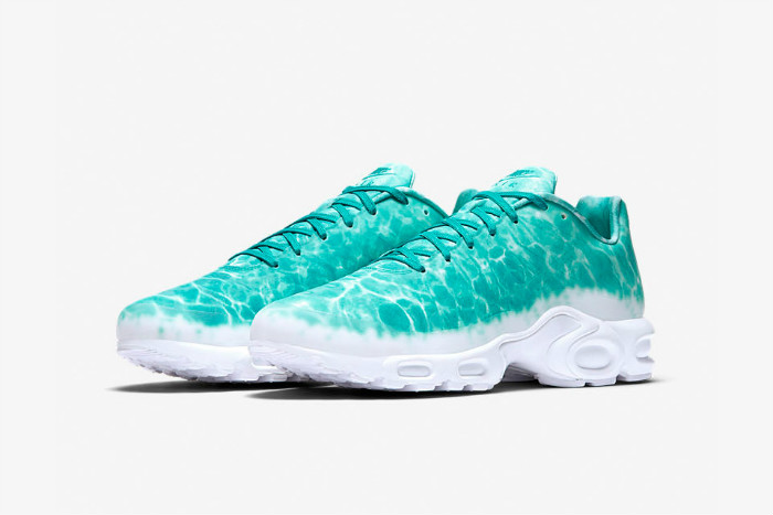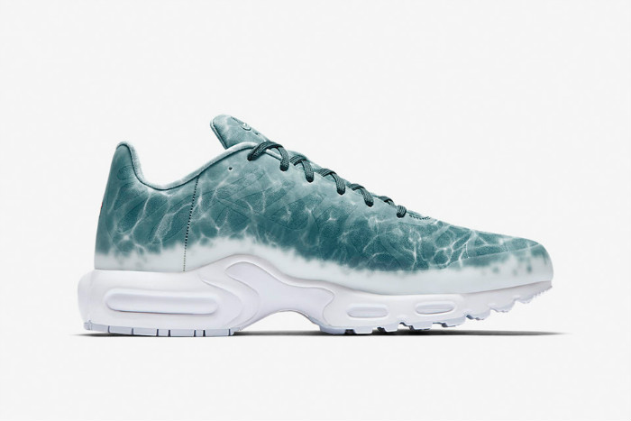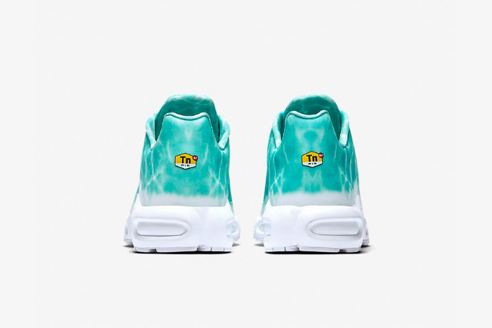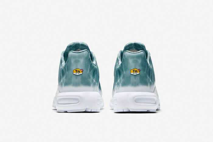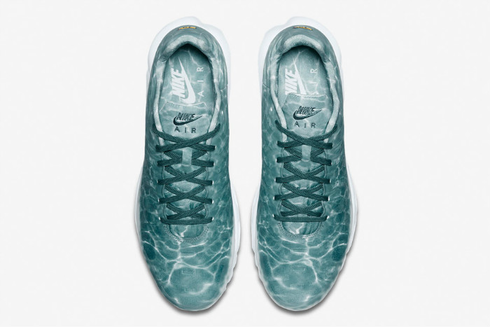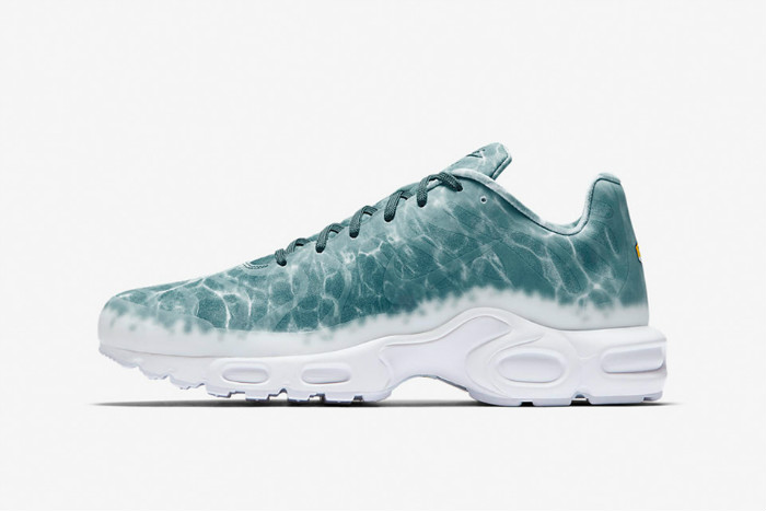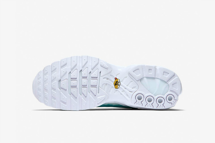 这款 NikeLab Air Max Plus “Le Requin” 以鲨鱼为主题,鞋身采用绿湖蓝为主色调,并配有水波纹路。鞋面下方与中底则是采用纯白色设计,设计灵感来源于鲨鱼腹部上的白色部分。鞋底与后跟 “TN Air” 是否预示着这个停产的科技即将回归。