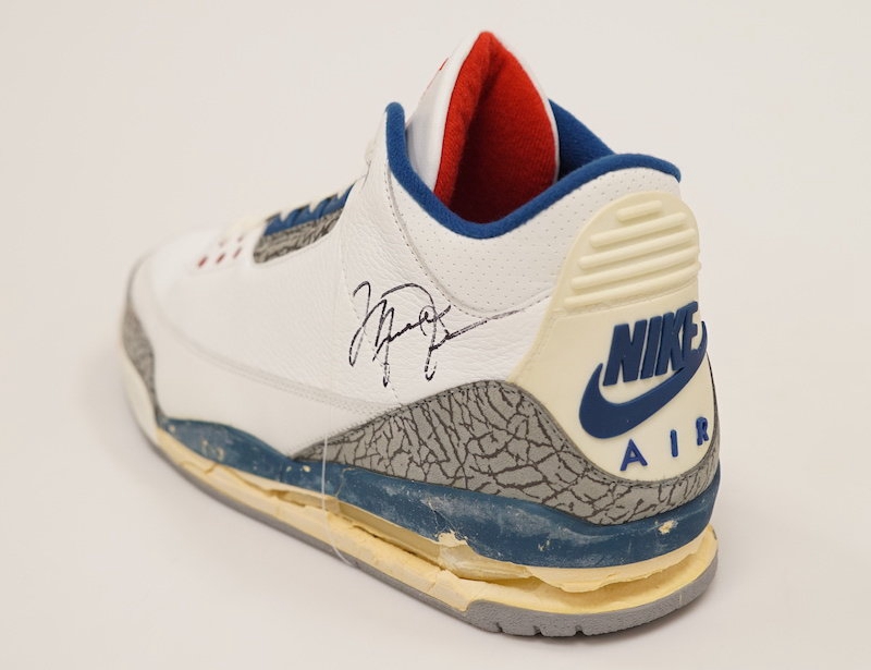 作为 1988 年首发的三款配色之一,这款被乔丹本人亲签的 Air Jordan 3 OG “True Blue” 虽然中底已经粉化开裂,气垫也以发黄露出,但是我们依旧能够感受到当年乔帮主的王者霸气。同时这也是见证 80 年代后期球鞋文化正在萌芽时期的珍贵证据。