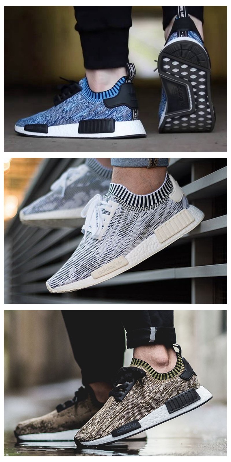 而随着配色的不断释出,鞋款也从最初的 NMD R1 PK 发展到菲董的 Human Race。从 Primeknit 编制物料到 Mesh 织物网面,再到 Chukka 的麂皮材质。NMD 在鞋型和配色两个方面都已达到让人眼花缭乱的境界!