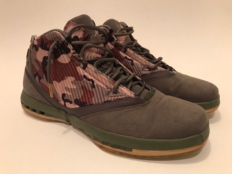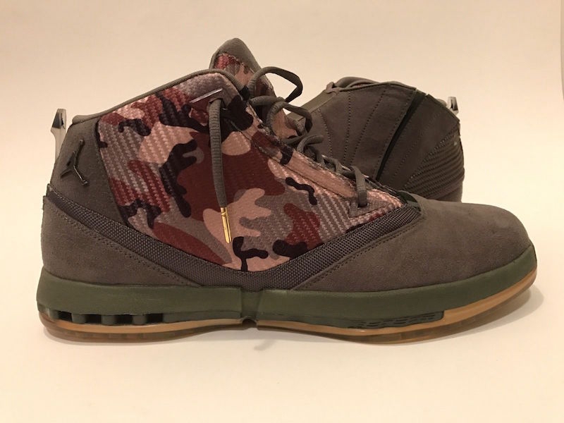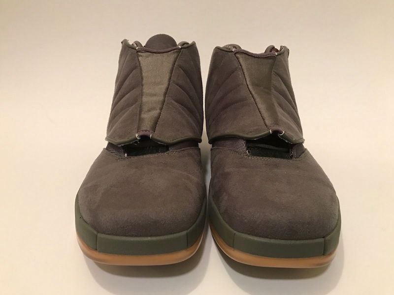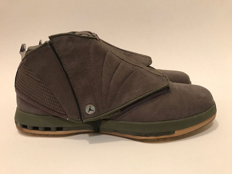 这款 Air Jordan 16 “Veterans Day” PE 全鞋面采用军绿色麂皮制作而成.而在拿下标志性的磁性鞋盖之后,沙漠迷彩图案跃然而出,带给人独特的视觉感受。生胶外底的运用也充分向人们展示了向军人们致敬的主题。整双鞋犹如军靴一般,展现出的军武之气令人敬仰。