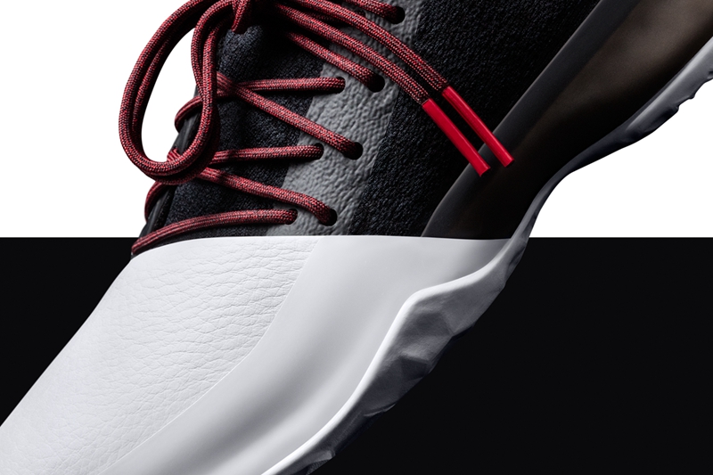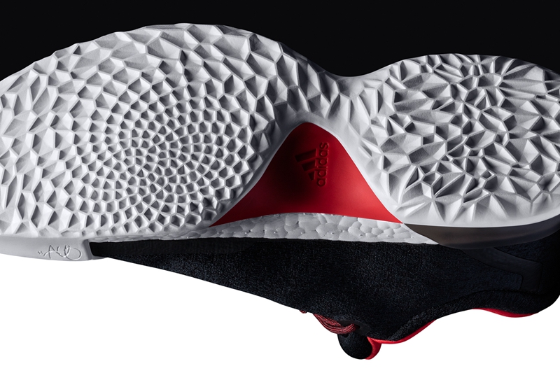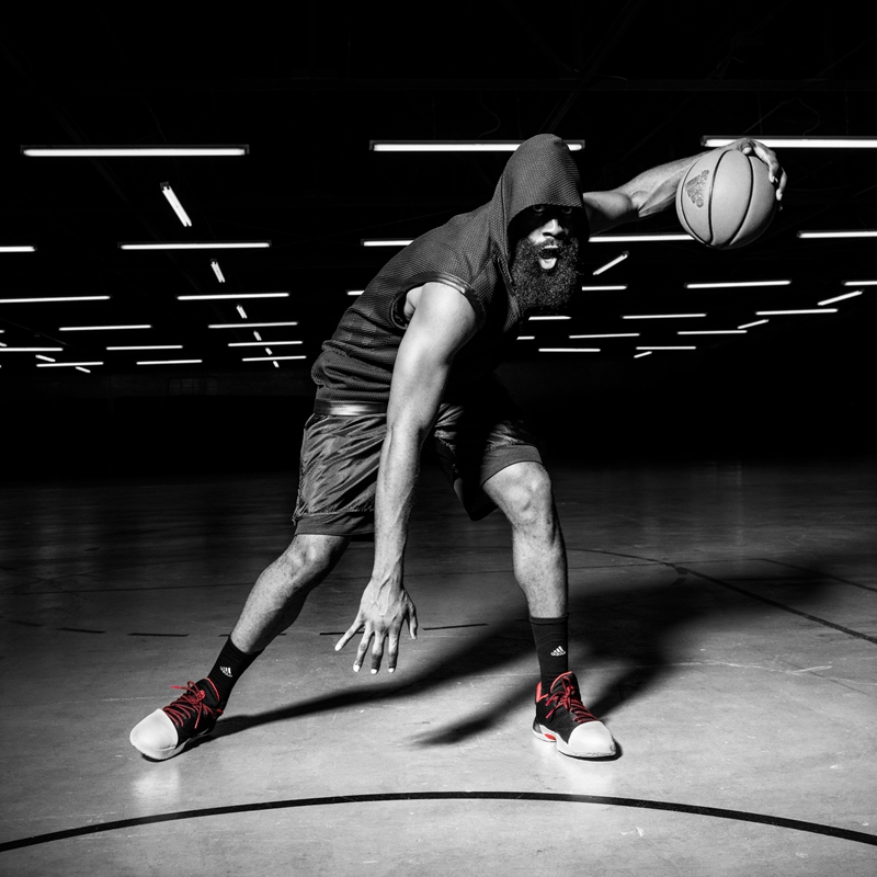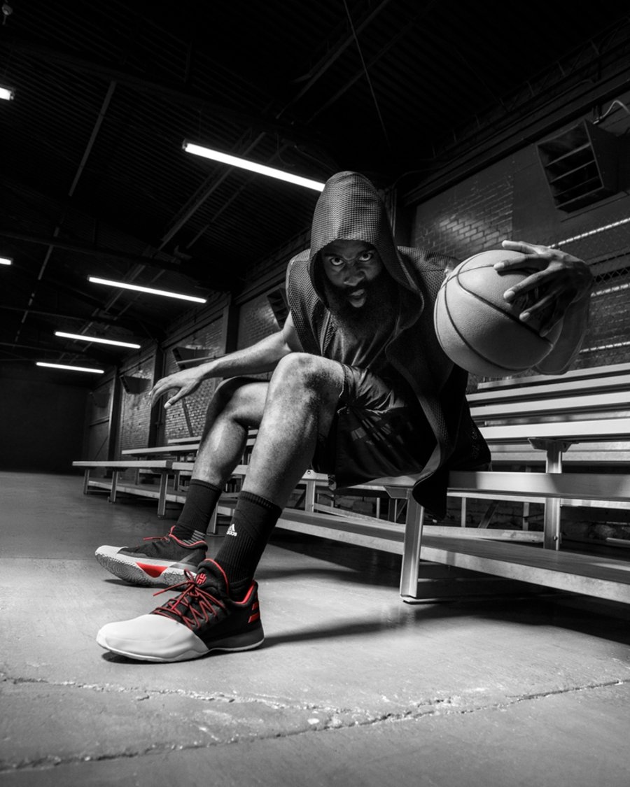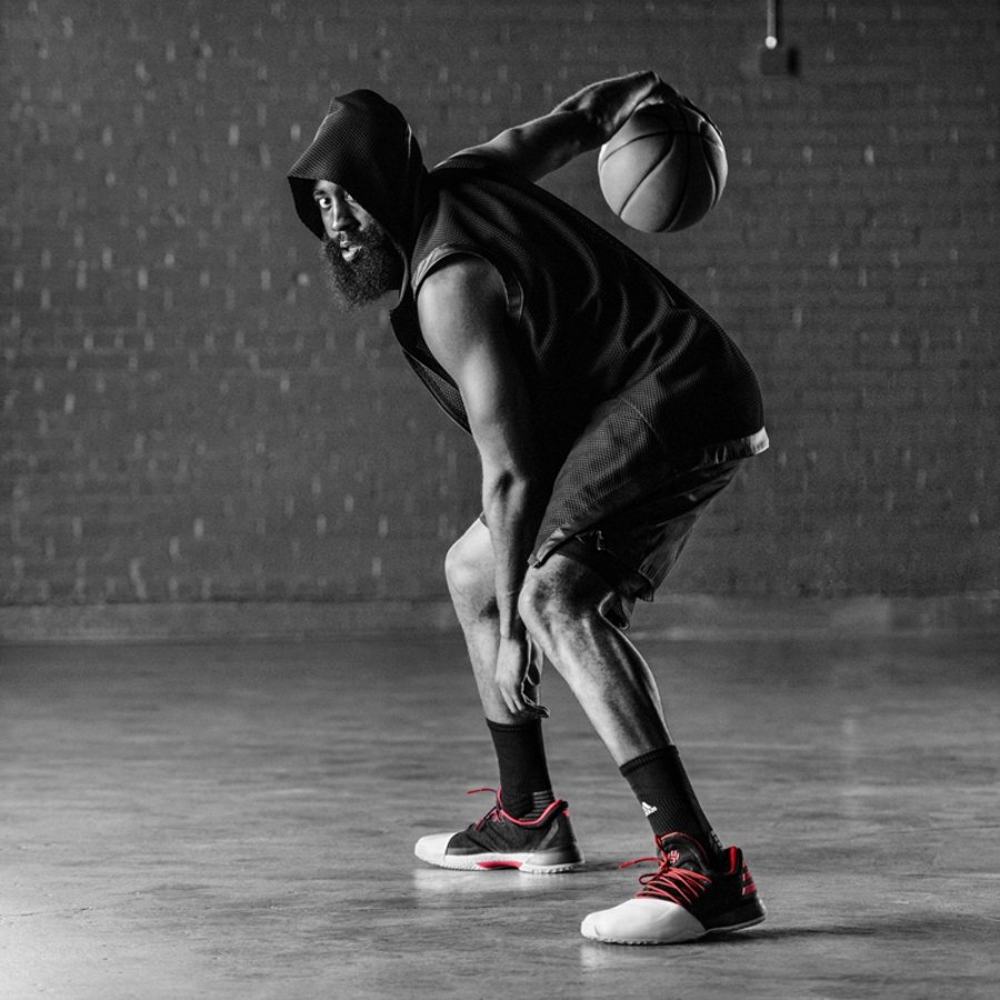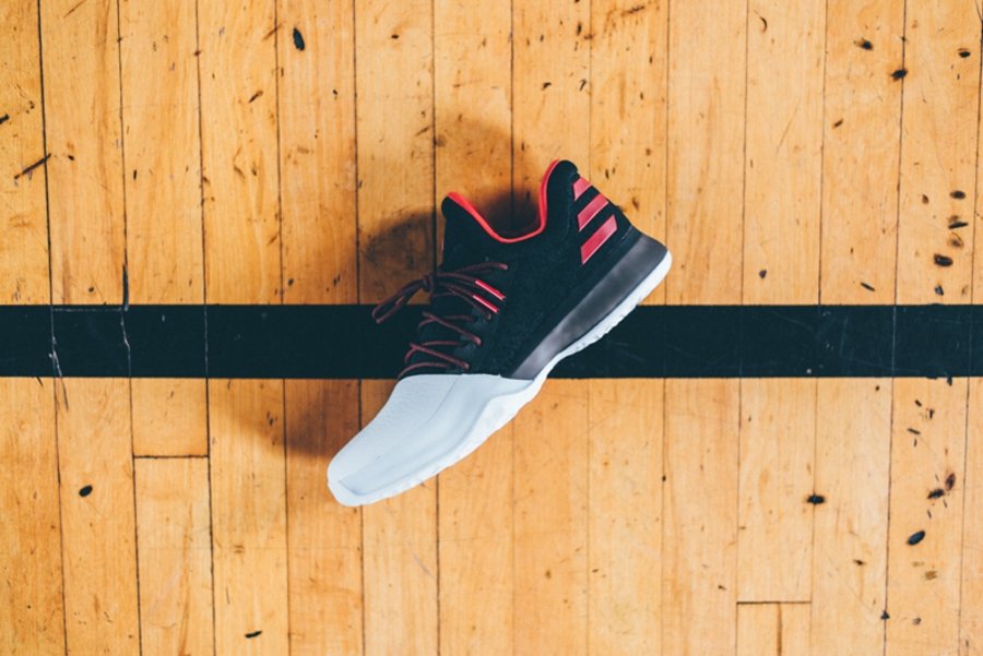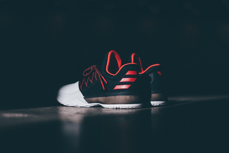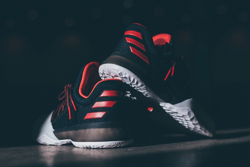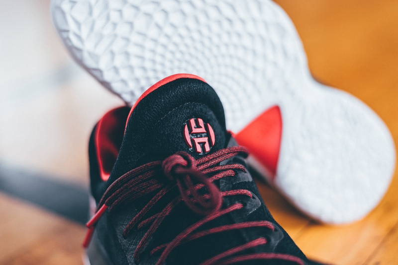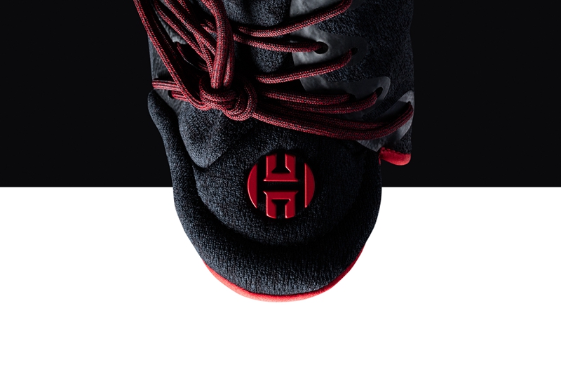 外部设计采用了黑色的外倾式流线鞋面,搭配白色的变向支撑鞋面以及红色的哈登个人 Logo。
