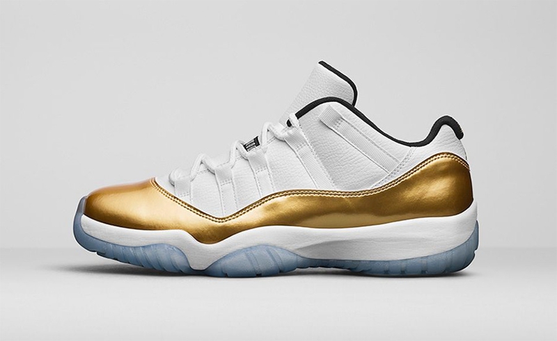 为庆祝 2016 里约夏季奥运会,Jordan Brand 特别打造了一款白金主题的 Air Jordan 11 Low 球鞋。耀眼的金色鞋头与白色皮革鞋身相互映衬,诠释出华丽的奥运盛况。