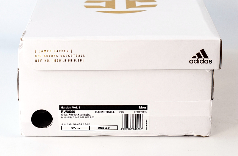 拿到 Harden Vol.1,首先映入眼帘的鞋盒就有别于传统的黑黄 Boost 式样。采用白底金标打造的包装,除了常规的尺码贴标以外,盒盖上烫印出 JAMES HARDEN 的个人名称,并将登哥的出生日期标注出来(89.8.26),像这样人性化的个人印记,后面还将屡次出现。