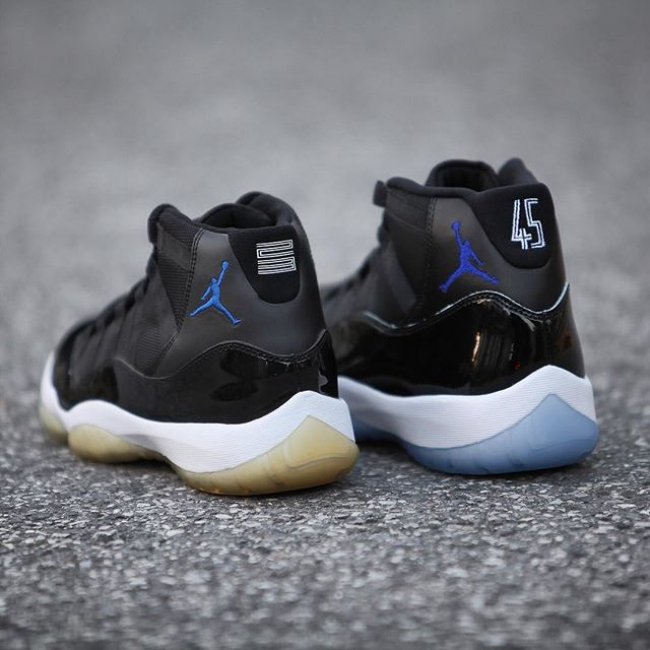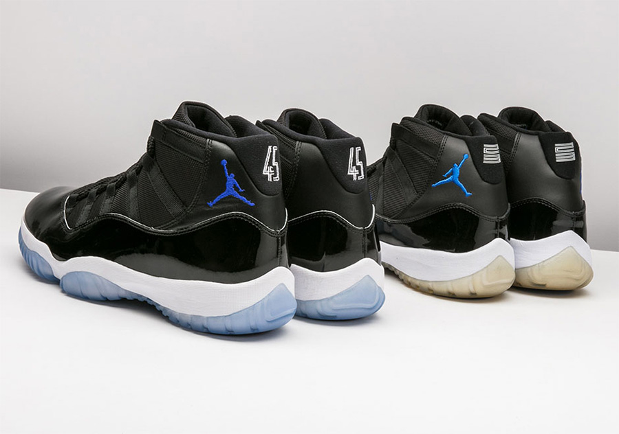 Air Jordan 11 “Space Jam” 2016 款鞋帮处的 Jumpman Logo 不仅颜色变深,而且“小飞人”方向都朝向鞋头。