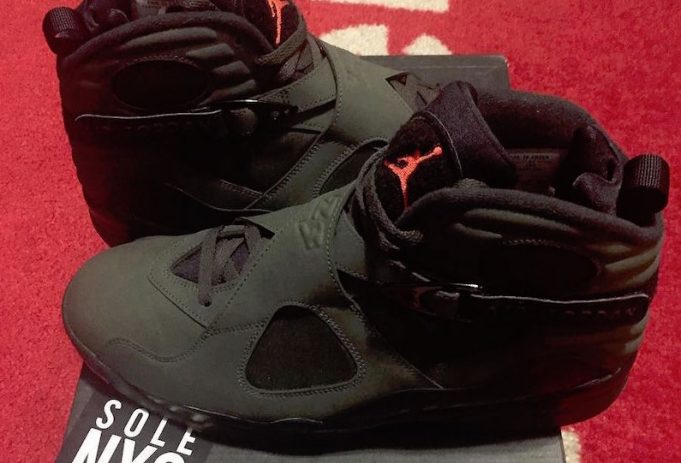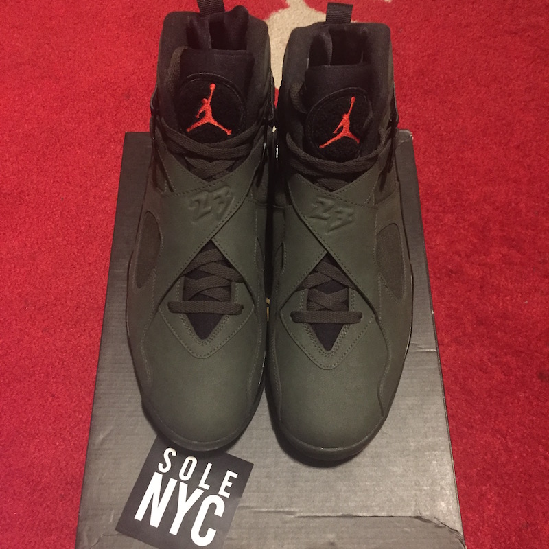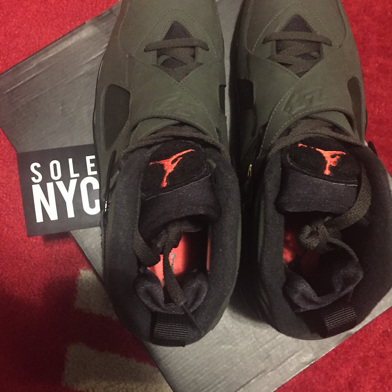这双 这款 Air Jordan 8 鞋身以橄榄绿为主色调,搭配橘色细节与白色中底,整体效果极其像是 Undefeated 配色。