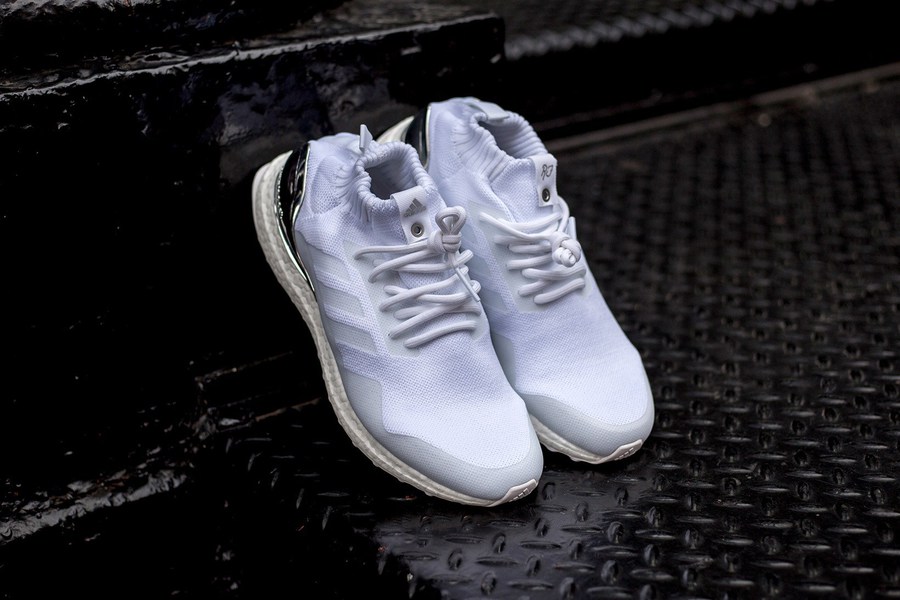 鞋帮高度提升为袜套设定,纯白鞋身辅以银光闪闪的 Heel TPU,鞋身的三条杠则以更为简约的网眼纹理呈现,中底和外底则是熟悉的 UB 方案。
