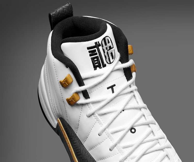 金色鞋扣与鞋身两侧的 Jumpman Logo 也均采用竹木花纹。鞋舌上显眼的“贰拾”字样,从正反双方体现出 Air Jordan “12代” 和 Jordan 品牌进入中国“20年”的双重含义。