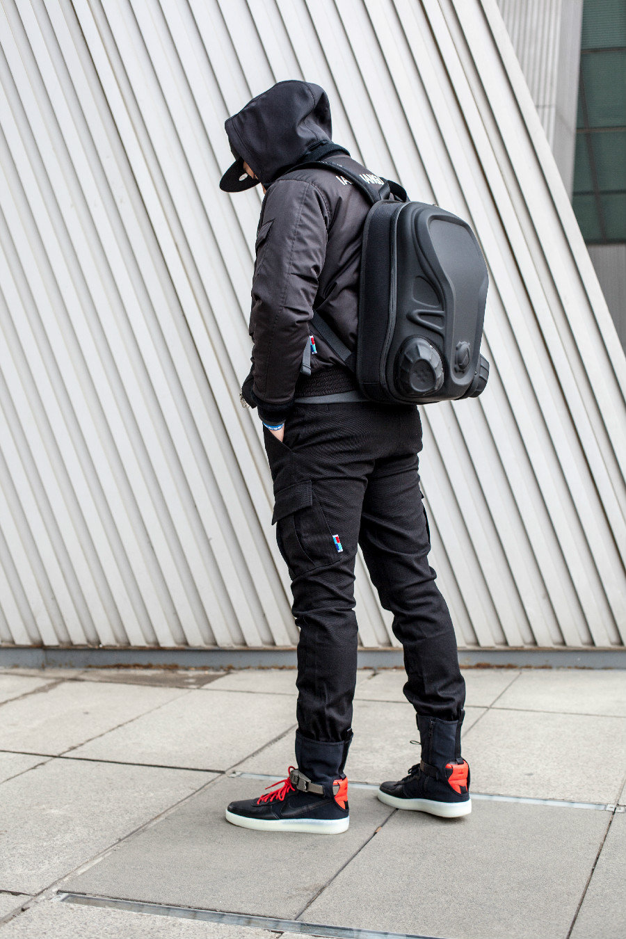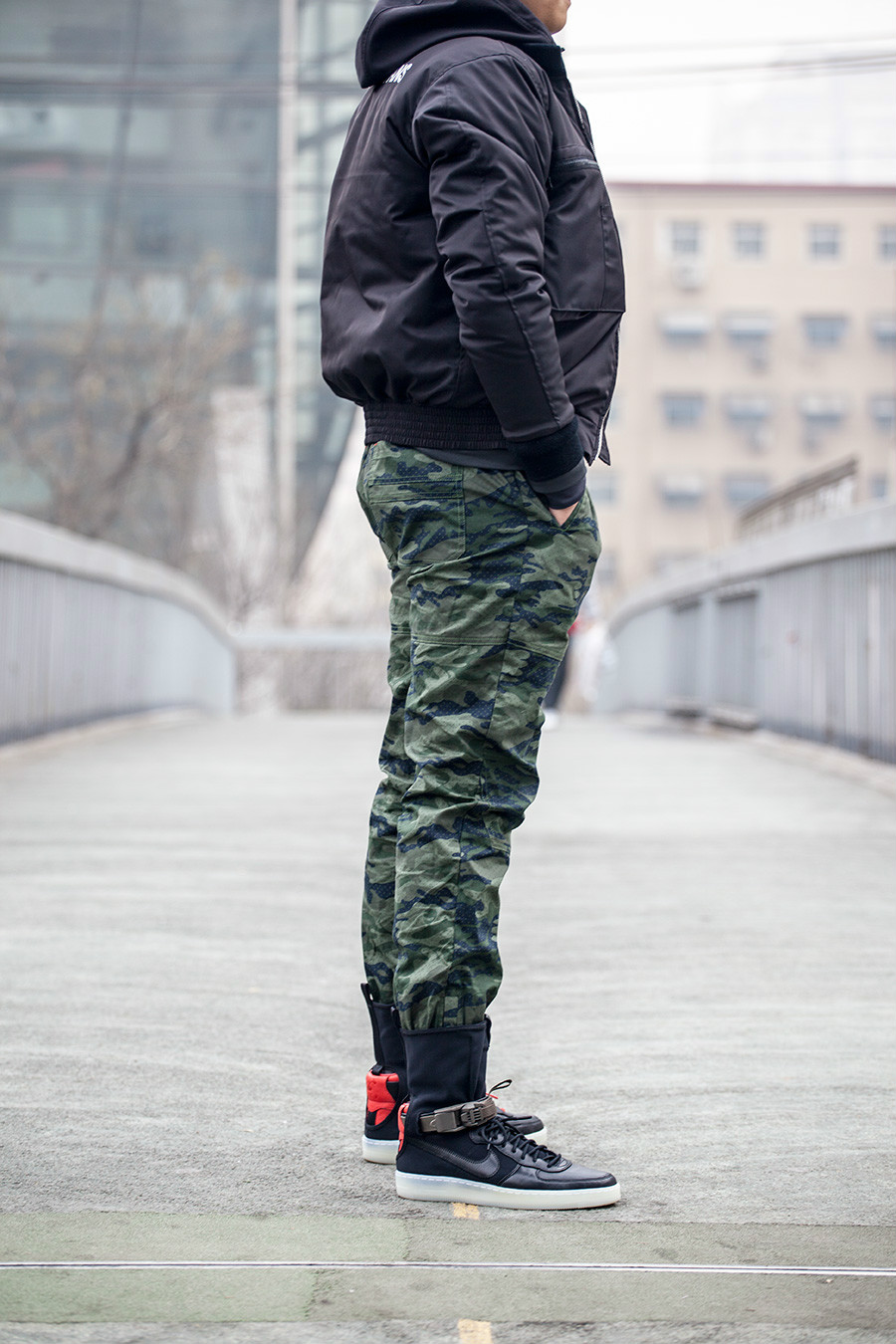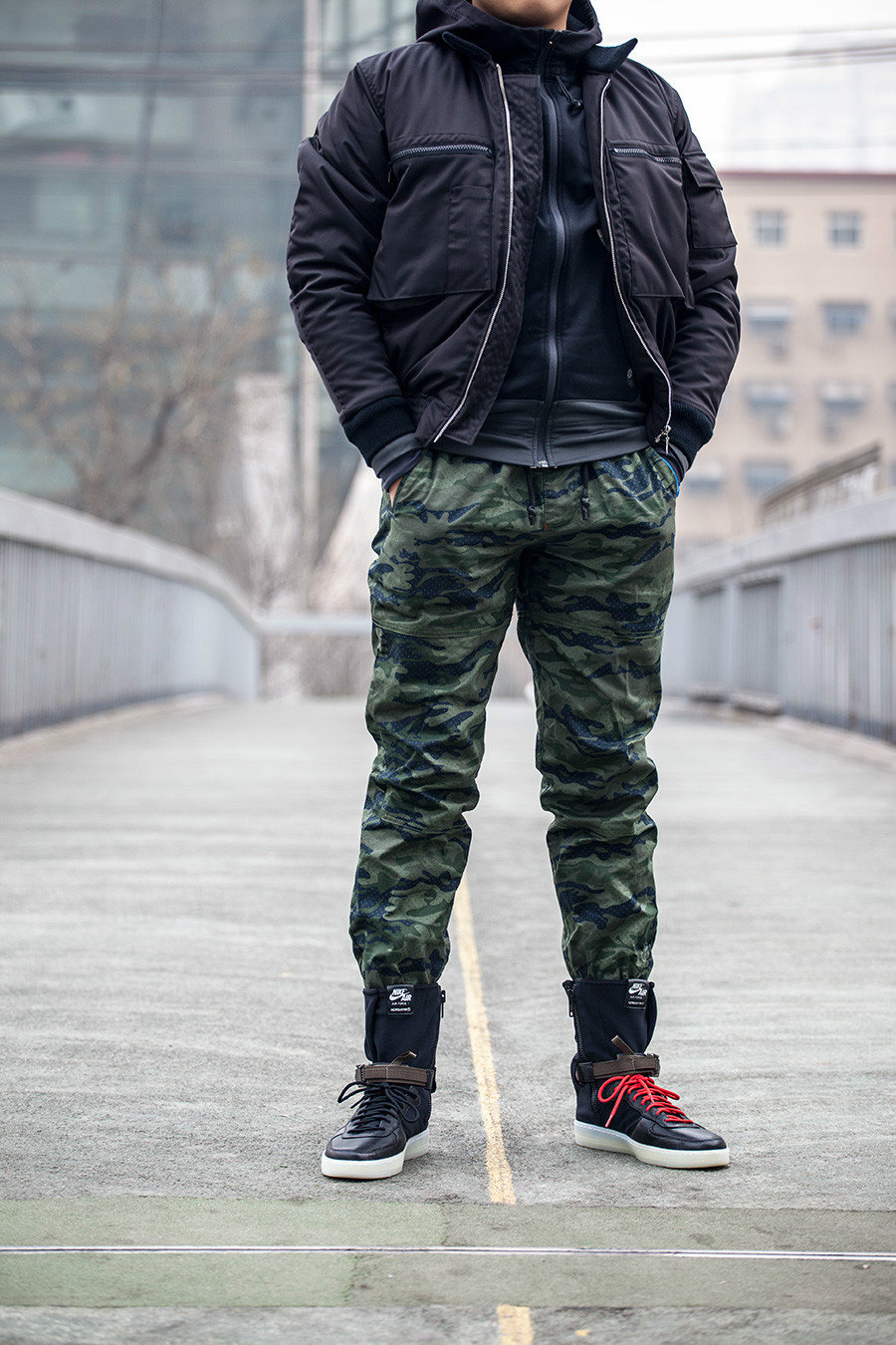 再来看看小编的穿搭演示!为了配色这双鞋的机能军事风,小编特意穿着了一款 MA-1,防毒面具造型的背包也是同样的超现代视觉体验!