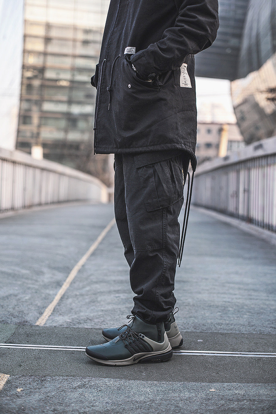基于宽松的 Cargo 裤型打造,布料的网格纹理、裤腿处的收束装置,都有极高的辨识度。