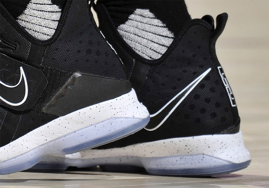 这双黑白配色的 LeBron 14 再度亮相詹皇脚上,既采用了 LeBron 12 时期就开始的气垫方案,也融合了 Soldier 战士鞋款的绑带设计,同时鞋帮的材质和设计也颇有 KD9 的感觉! 这双 LeBron 14 作为詹姆斯第十四代签名战靴,目前有着褒贬不一的市场反响。不过可以预见,这是一双实战性能极为突出的球鞋,在发售之后,相信具体的实力表现能够改变目前的言论风向! 而这款黑白新配色也是市售配色,将于 1 月 28 日正式发售,货号为 921084-002。