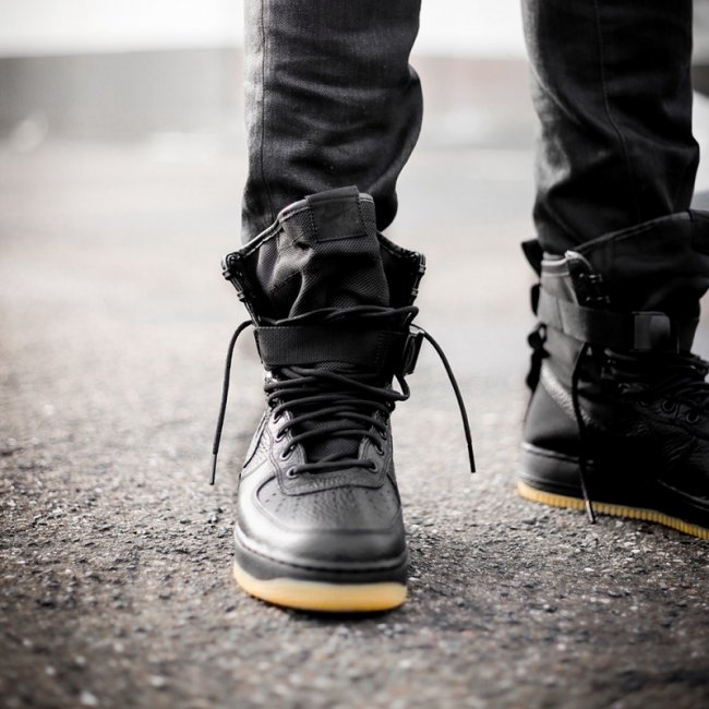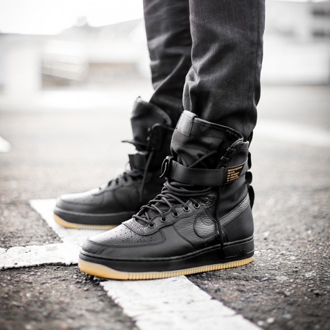 眼前这双 Nike SF-AF 1 “Black/Gum” 采用全黑皮革鞋面拼接抗撕裂尼龙高帮鞋身,搭配踝织绑带保护,延续了系列一贯的军事机能。黑色中底一改此前的卡其装扮,呈现出浓浓的黑魂气质。