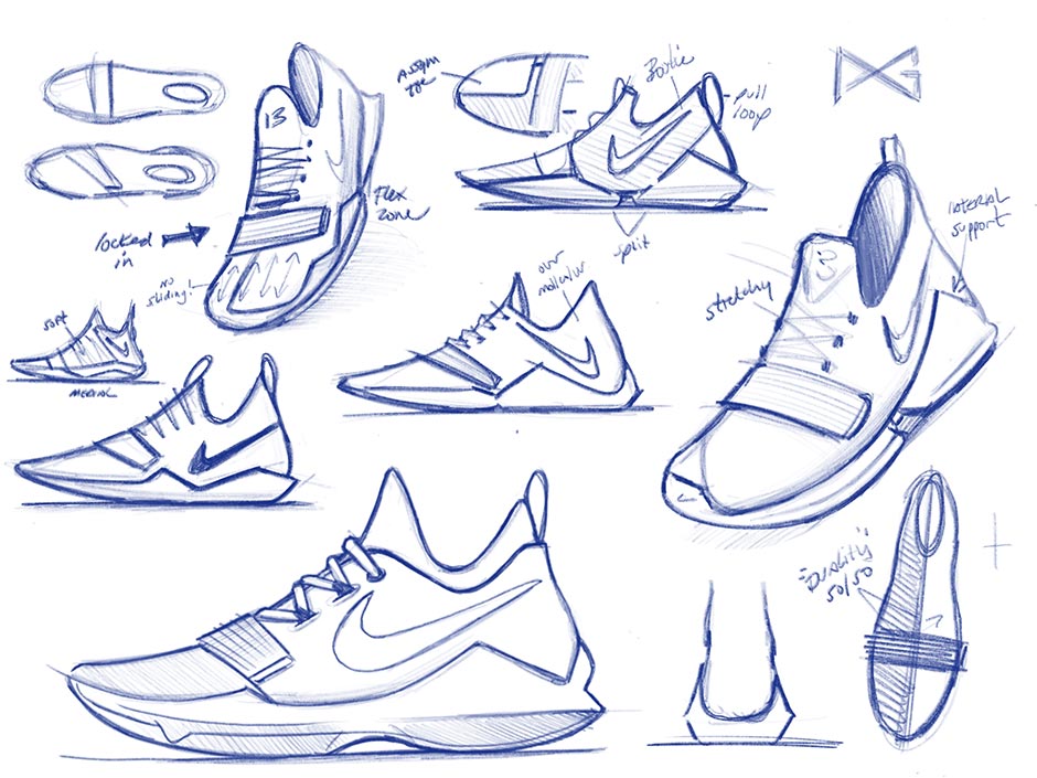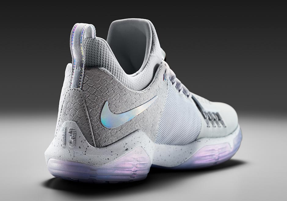 这款 Nike PG1 2K 是由乔治与设计师托尼·哈德曼共同合作设计的成果。鞋身整体以乔治的钓鱼爱好为蓝本,将一体化鞋面设计成鱼鳞形状,鞋带上放的原型鞋扣是根据钓鱼的浮漂设计而成,炫彩的 Nike Swoosh 如同阳光下的鱼鳞闪闪发光。鞋垫中印有保罗·乔治为 2K17 拍摄的游戏封面,与该款球鞋的主题相对应。