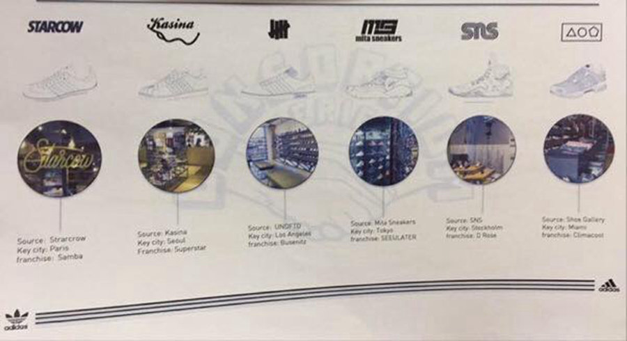 来到 2017 年,adidas 将规模再次扩大,一口气邀请了 84 间店铺加盟 “Consortium Tour 2017”,并正式公布了首回合参与联名的店铺清单。除了我们熟知的 KITH(NYC)、Juice (Shang Hai)、Undefeated (LA) 外,英国著名潮流巨头 END.等一众大咖位也将位列其中。