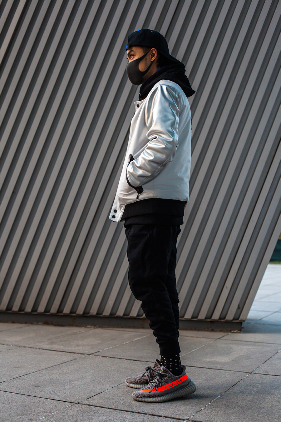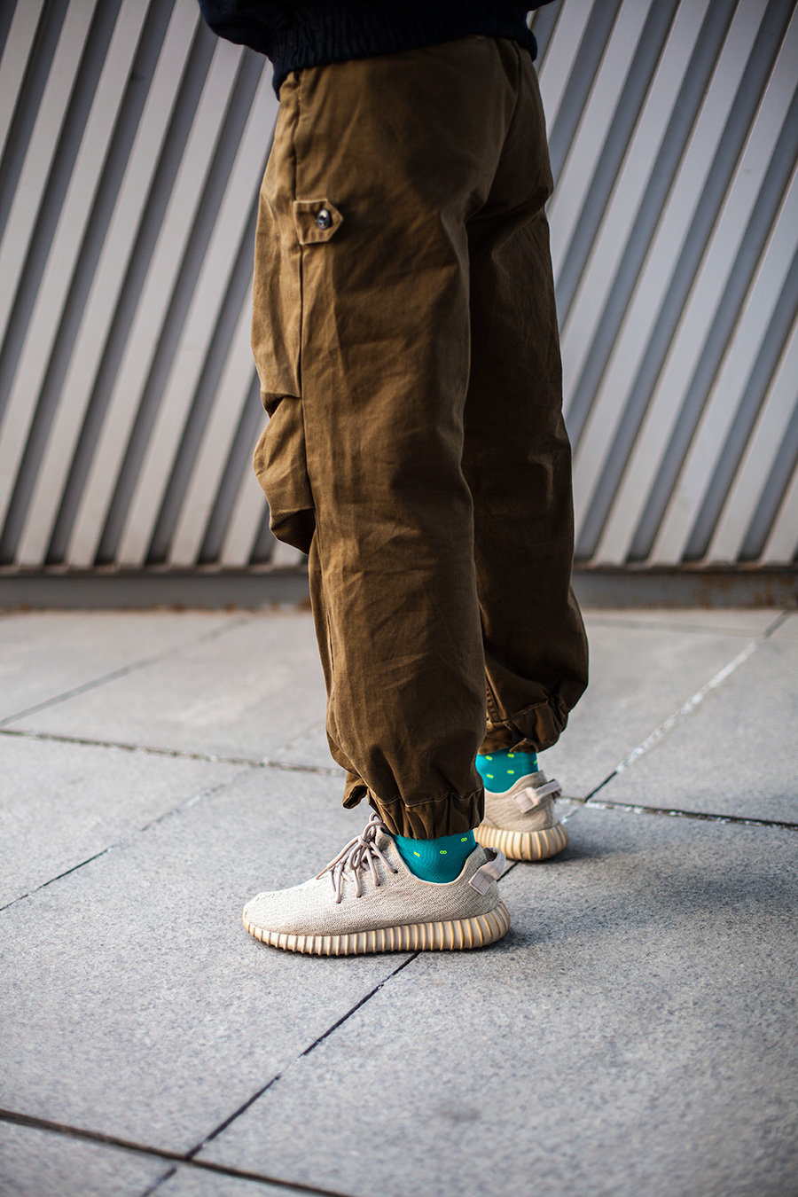 这一天小编换上了 VERTEX LONDON 的黑色眼睛袜款,带有 3M 反光效果,黑袜子配黑裤子,视觉的过渡效果更为自然,而眼睛造型则成为 Yeezy 的陪衬,进一步放大亮橙装饰的夺目效果。