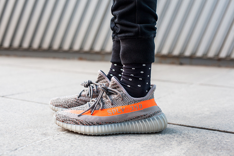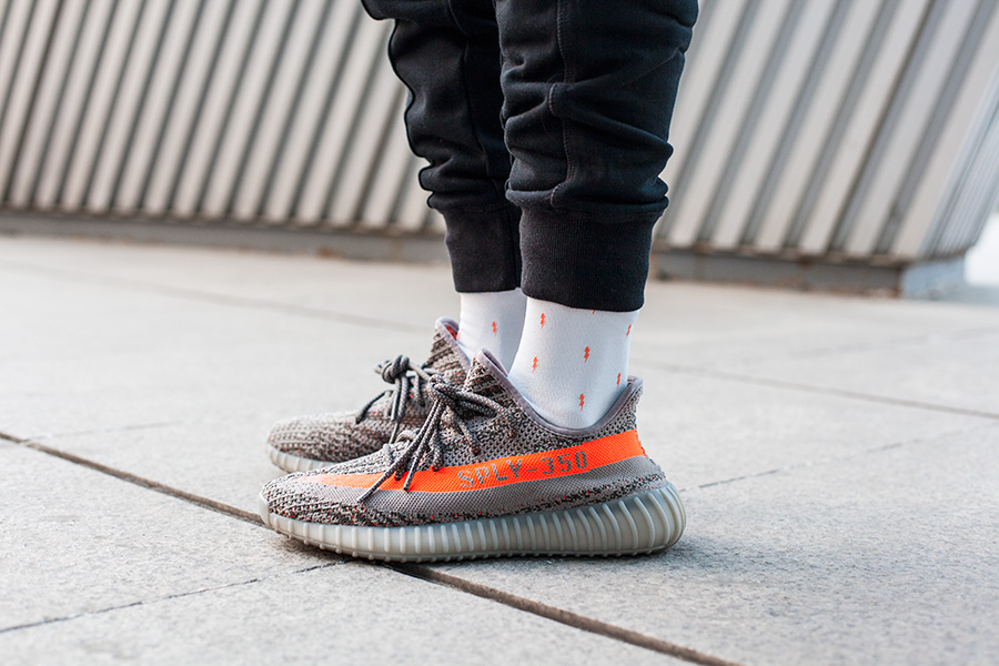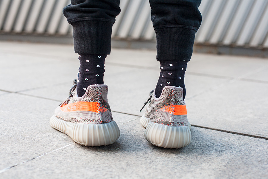 低帮的 Yeezy 350 Boost V2 灰橙配色亮点不凡,而带有反光细节的 VERTEX LONDON 袜款同样夺目!