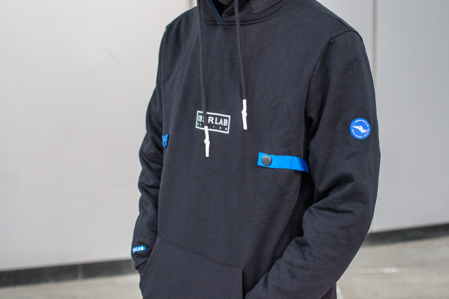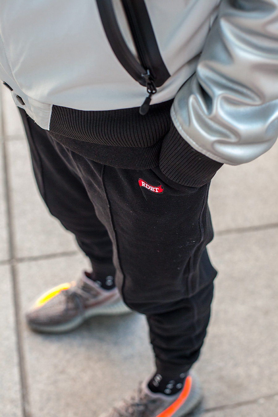 黑色的 RDET 束腿裤,搭配白银配色的 BOUNCE 斗心魔夹克,小编选用了内穿帽衫的组合。