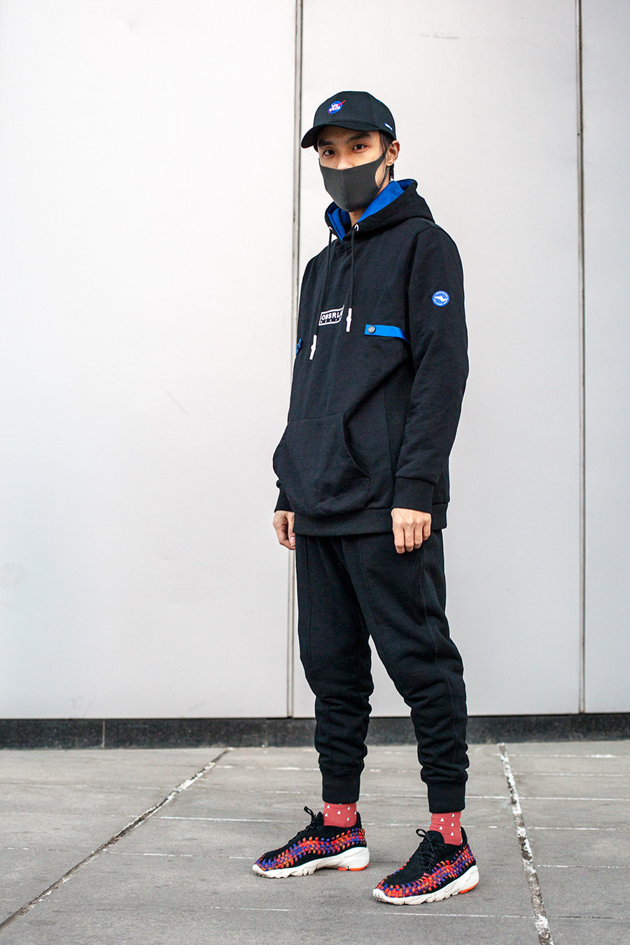 一身黑装,再加上黑色麂皮材质的 Nike Air Footscape Woven “Multicolor”,红色袜子同彩虹编织的艳丽色调相呼应,上身黑蓝,下身黑彩,恐怕撞衫撞鞋的几率为 0!
