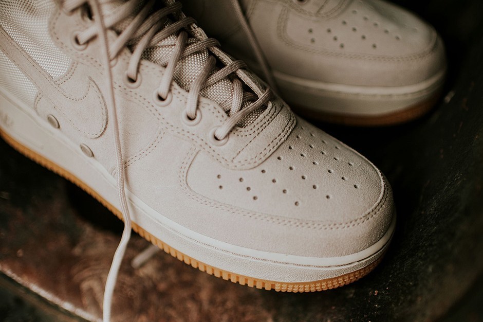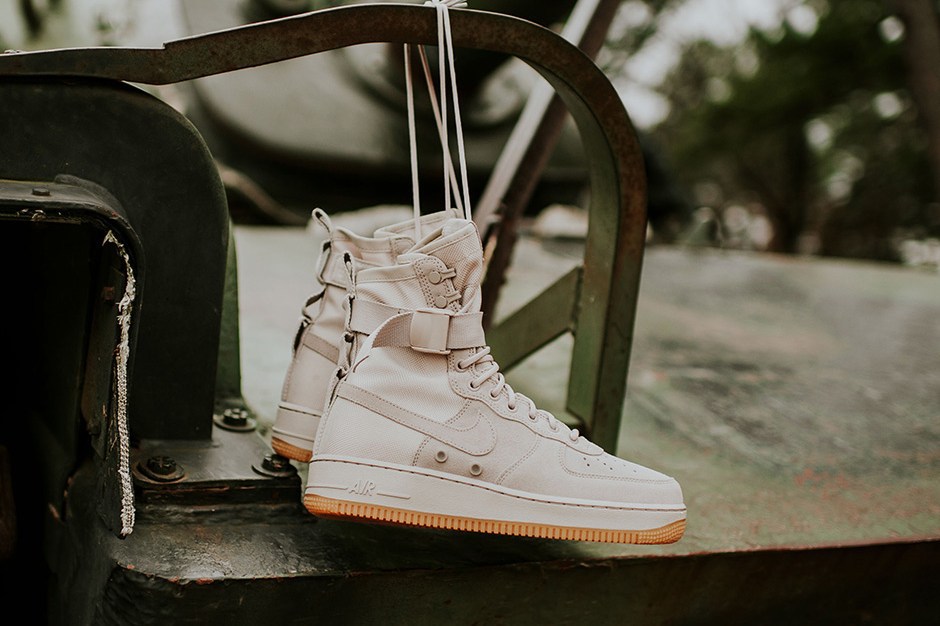 该款 Nike SF-AF 1 采用 String 配色,设计师特别选具有防水特性的麻色帆布,最后搭载灰白色中底呈现。此外包括 10 孔设计、编织踝带和军用 SPEC 标签在内的招牌细节也全部保留,极致演绎军事户外型格。