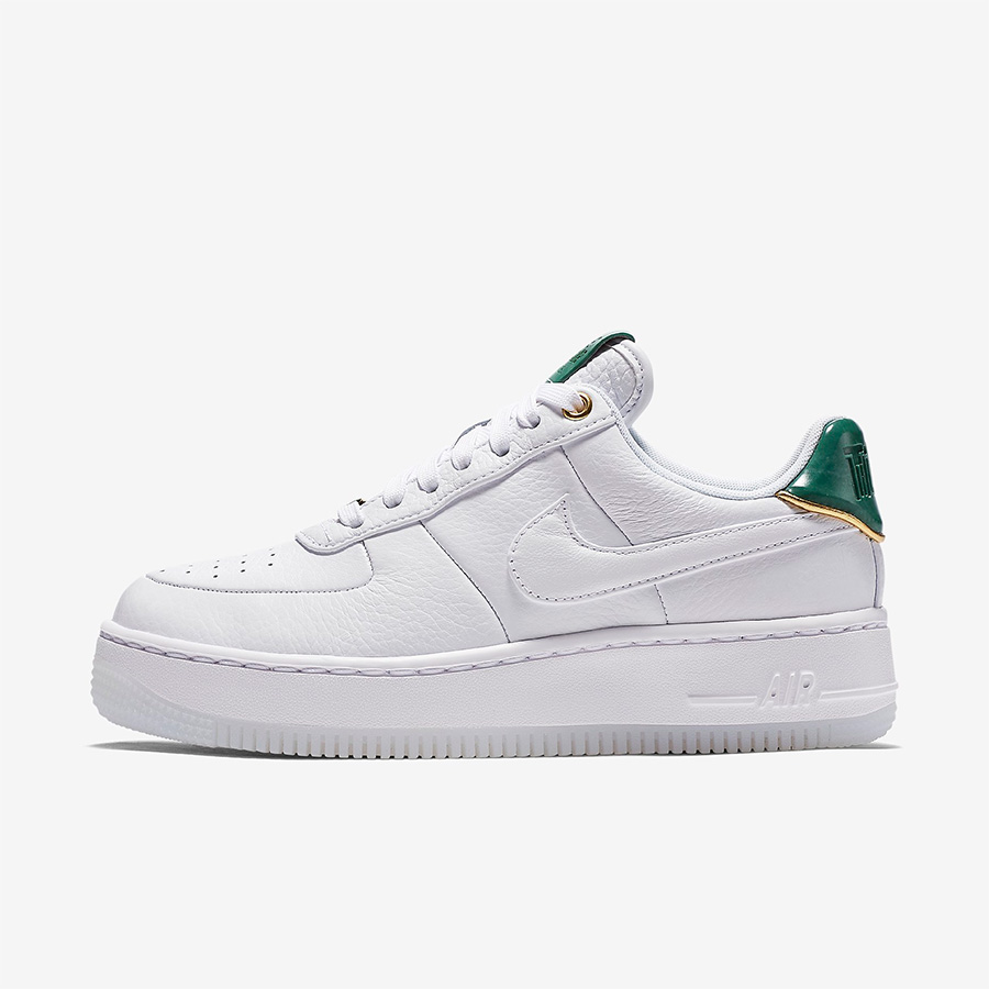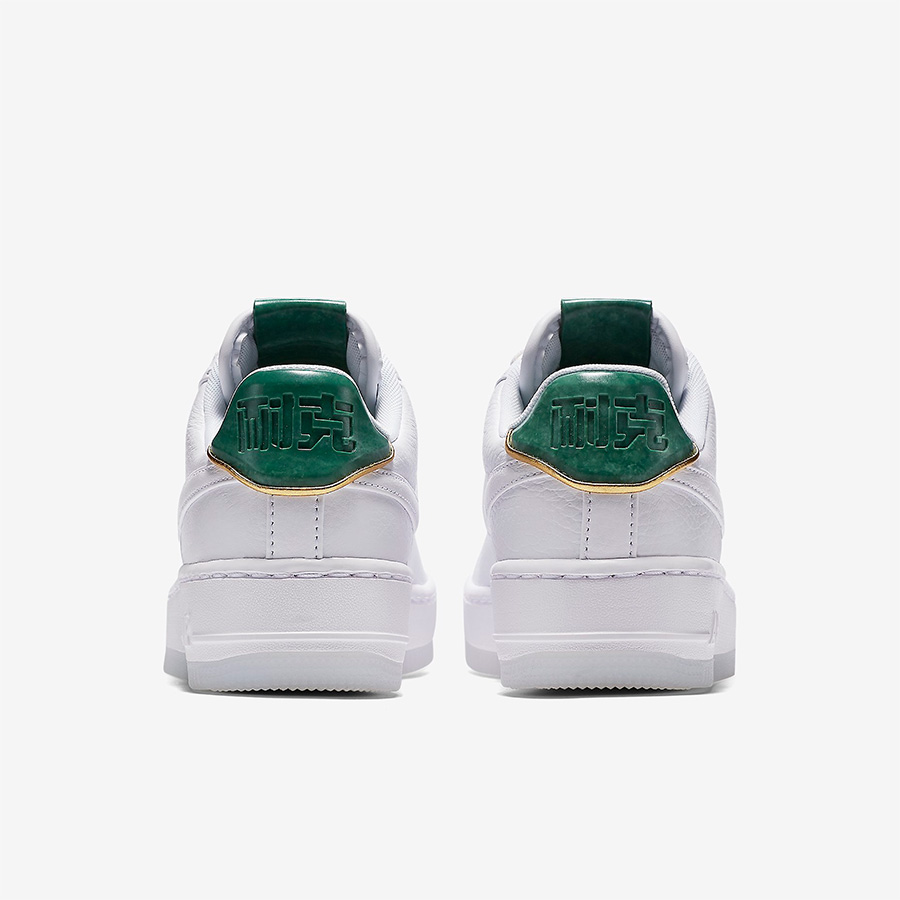 采用了加厚鞋底的全新鞋型 AF1 Upstep 作为蓝本打造,全白的小白鞋清爽装扮,再注入温润的玉石绿点缀鞋舌和后跟。细腻质感的荔枝皮鞋身,水晶材质包裹外底,加上皮革鞋垫,在用料和细节设定上,都尽显奢华感受。