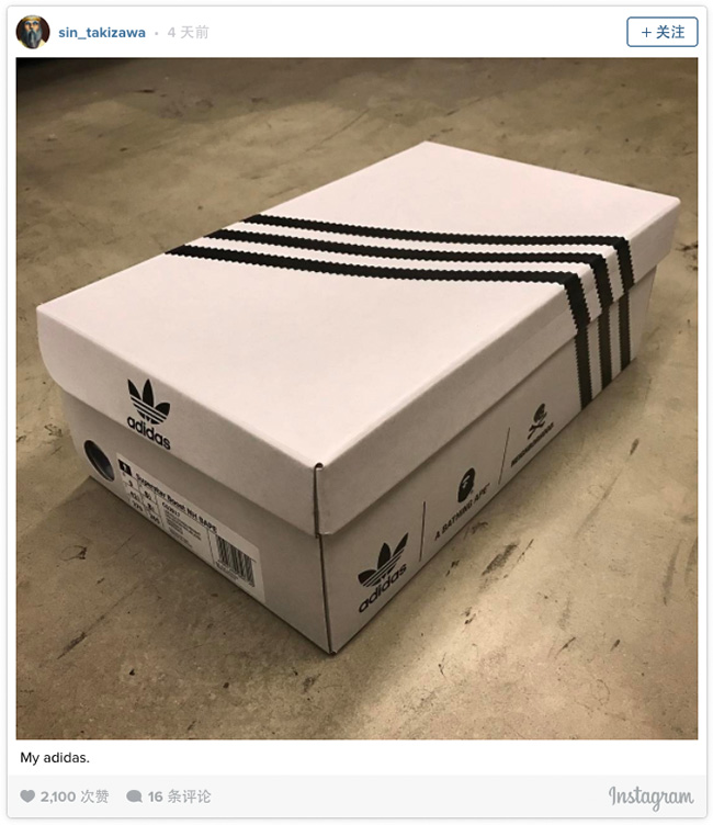 NBHD 的主理人瀧泽伸介已经在自己的 Instagram 上晒出了这一三方联名的鞋盒,除了三条杠的经典装饰,也能看到三方的 Logo 和货物名称 Superstar BOOST NH BAPE,看来正式发售已经极为临近了!
