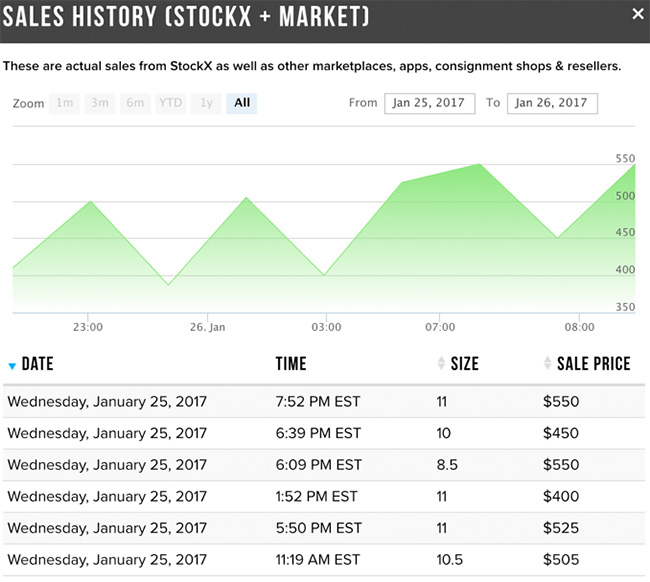 在发售之后,StockX.com 平台也开始有了成交记录,成交价则主要在 $450 ~ $550 美元之间,折合人民币则在 ¥3000 ~ ¥4000 RMB 之间。