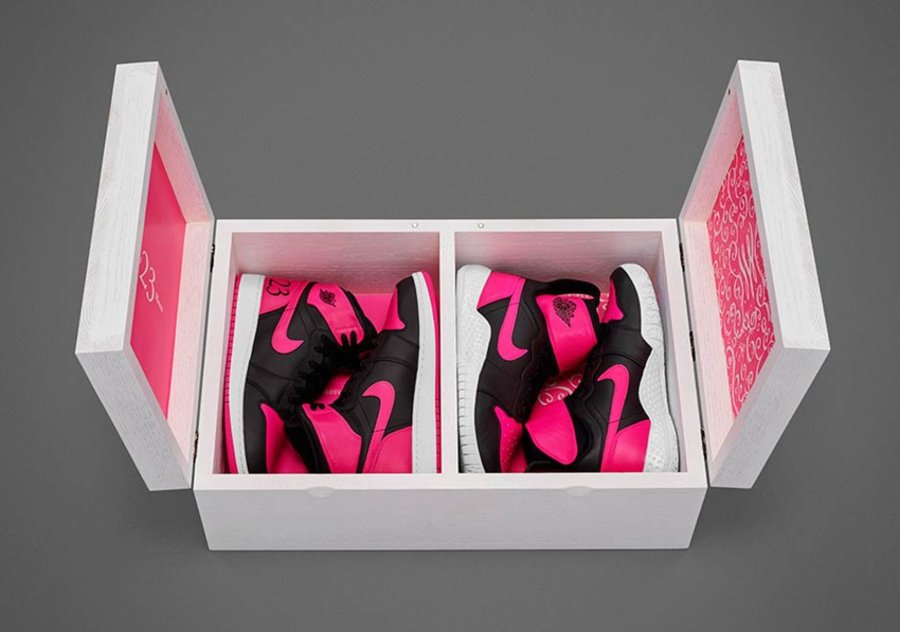 其中不仅有后跟特别注有 23 和个人标识的黑粉 Air Jordan 1,还包含以皮革打造的 AJ1 造型 NikeCourt Flare 网球鞋。