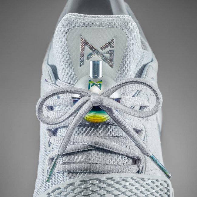 这款 Nike PG1 2K 是由乔治与设计师托尼·哈德曼共同合作设计的成果。鞋身整体以乔治的钓鱼爱好为蓝本,将一体化鞋面设计成鱼鳞形状,鞋带上放的原型鞋扣是根据钓鱼的浮漂设计而成,炫彩的 Nike Swoosh 如同阳光下的鱼鳞闪闪发光。鞋垫中印有保罗·乔治为 2K17 拍摄的游戏封面,与该款球鞋的主题相对应。