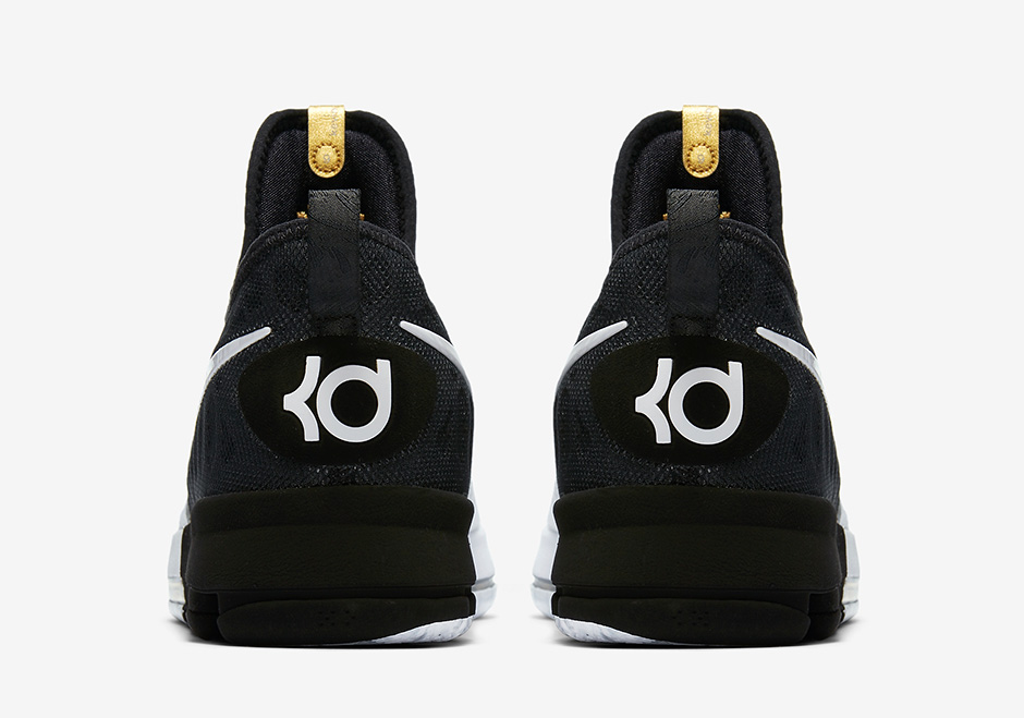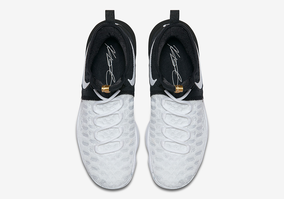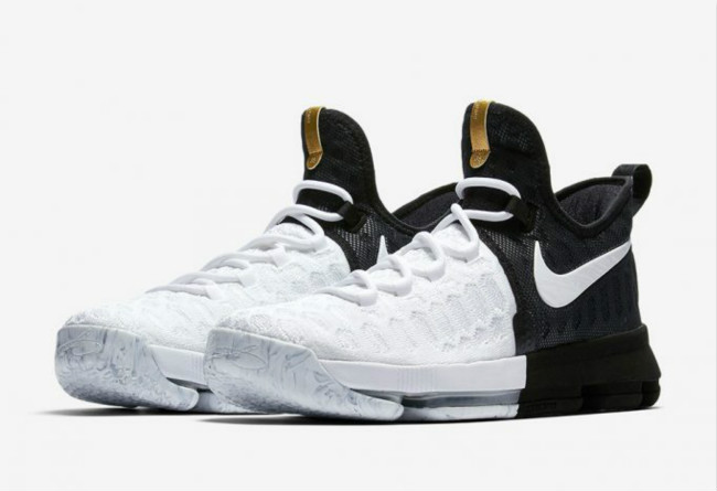 此番这款 Nike KD9 “BHM”,鞋身采用经典的黑白两色,在 Flyknit 材质上有着明显的黑白分割线,鞋舌上的金色标签如同点睛之笔般点缀鞋身。