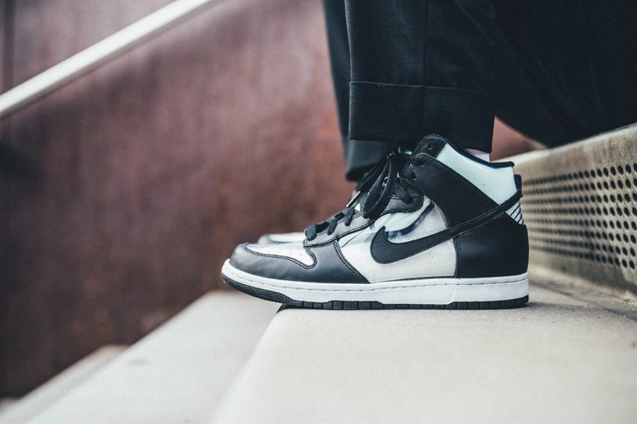 本次在 Nike Dunk Hi 黑色皮革框架之下,将鞋头、侧身、鞋舌等位置采用透明 TPU 大胆尝试,通过穿着者的袜子变换来营造出不同的视觉冲击,彩袜控是否已经跃跃欲试了?