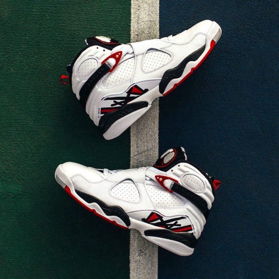 该鞋曾作为 Air Jordan 8 兔八哥备选配色而设计,整体以白色为主线,金属红细节与黑色交织呈现,营造出熟悉的公牛队气氛。